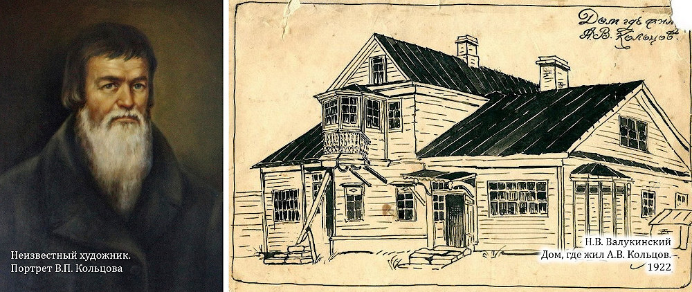 Алексей Кольцов родился 15 октября 1809 года в предместье Воронежа слободе Гусиновке. Отец поэта Василий Петрович — потомственный почетный гражданин города, купец-прасол, имевший большой авторитет в купеческих и дворянских кругах. Мать Прасковья Ивановна занималась детьми и домашним хозяйством. В семье были дочери Мария, Анна, Александра и Анисья. Алексей, после смерти младшего брата Владимира, был единственным сыном. Это обстоятельство определило его судьбу как преемника купеческих дел отца. С 1816 года Кольцовы живут в самой лучшей части Воронежа, на Большой Дворянской улице (проспект Революции), где недалеко от резиденции губернатора Василием Петровичем была приобретена усадьба с каменным домом и флигелем.