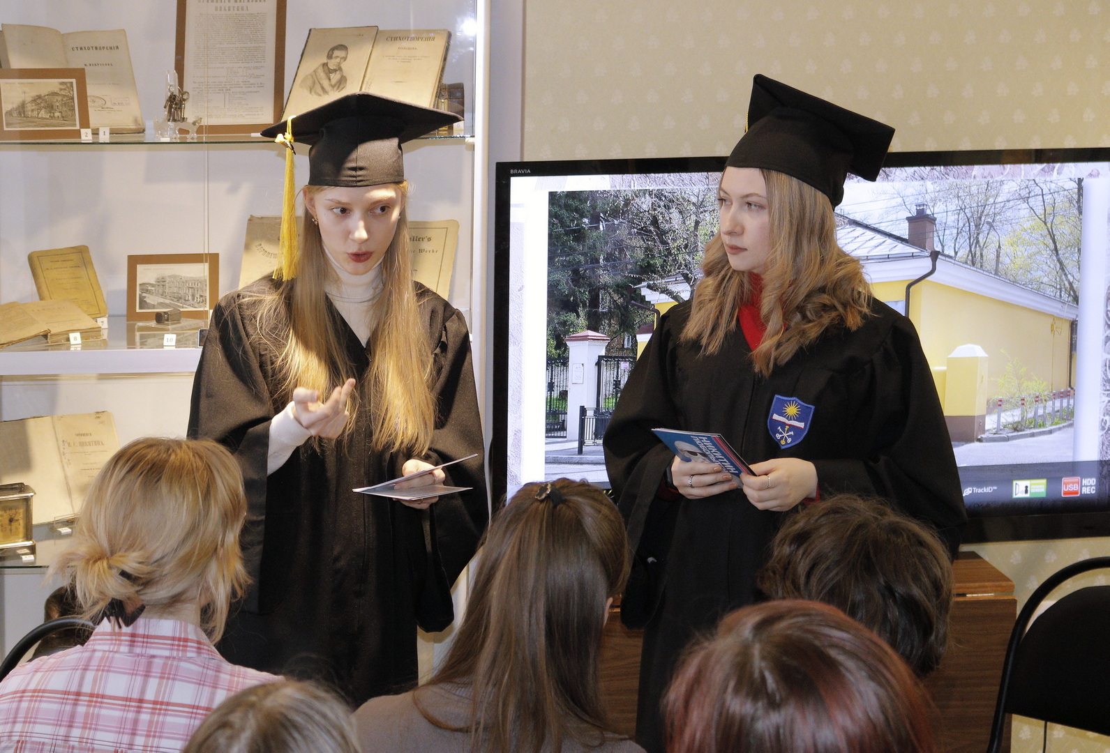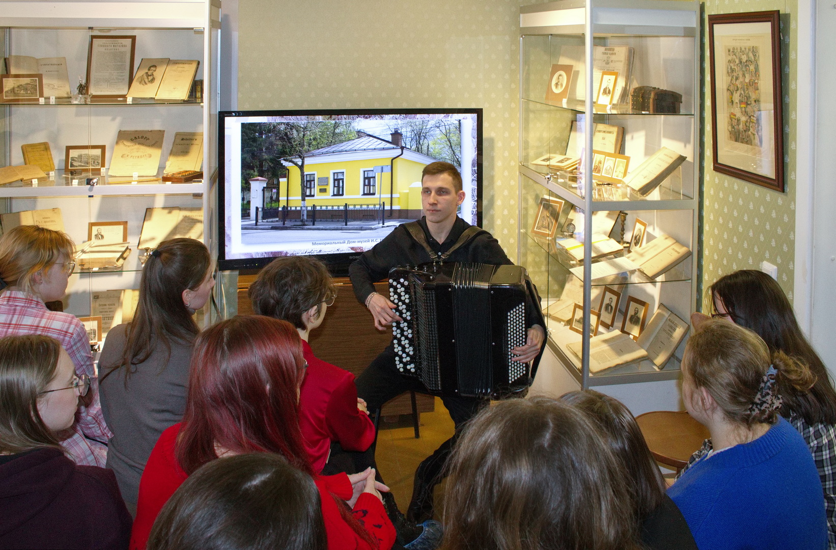 Началась программа с увлекательного описания Воронежа первой половины XIX века и биографии поэта Ивана Никитина, чья творческая и общественная деятельность неразрывно связана с историей Воронежской области. Сотрудник музея Лариса Печорина в стилизованном костюме барышни позапрошлого века рассказала, каким был город двести лет назад, о детстве поэта, творческом становлении Никитина в сложных условиях жизни и руководства постоялым двором. Праздничную атмосферу в доме-музее дополнили музыкальные композиции в исполнении на баянах студентами отделения оркестровых народных инструментов ВГИИ Вадима Лепихова и Дениса Недомолкина (класс доцента В.В. Калашникова). Яркое впечатление оставило стихотворение И.С. Никитина «Русь» в прочтении участника театральной студии «Зазеркалье» Максима Новикова. Далее речь шла об общественной деятельности поэта и о бурном развитии Воронежа во всех сферах, а также какими в то время были учебные заведения и театр.