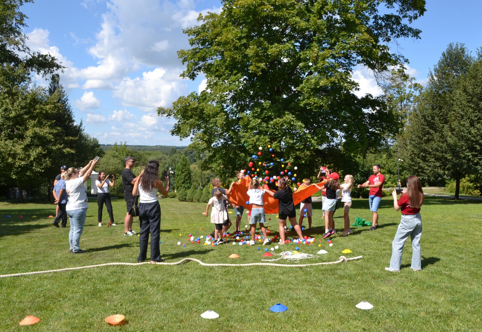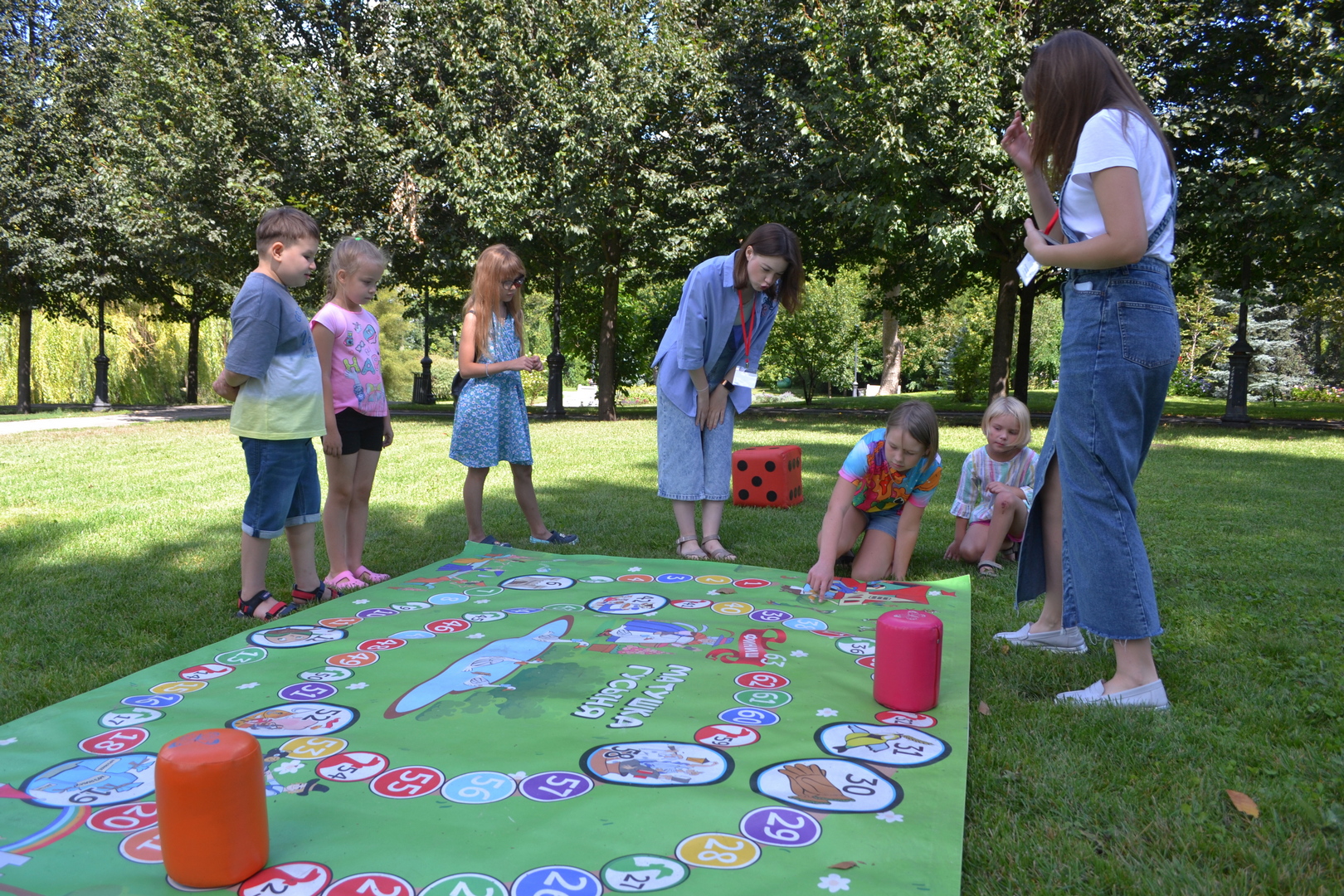В усадебном парке дети знакомились с переводным творчеством Самуила Маршака во время популярной музейной игры-викторины «Матушка Гусыня». Участники по очереди бросали большие мягкие кубики в виде игральных костей. Затем перемещались по полю, используя крупные яркие фишки, и выполняли задания. Юные участники вспомнили знаменитые стихотворения и персонажей Самуила Яковлевича, а в конце игры встретились с самой Матушкой Гусыней.