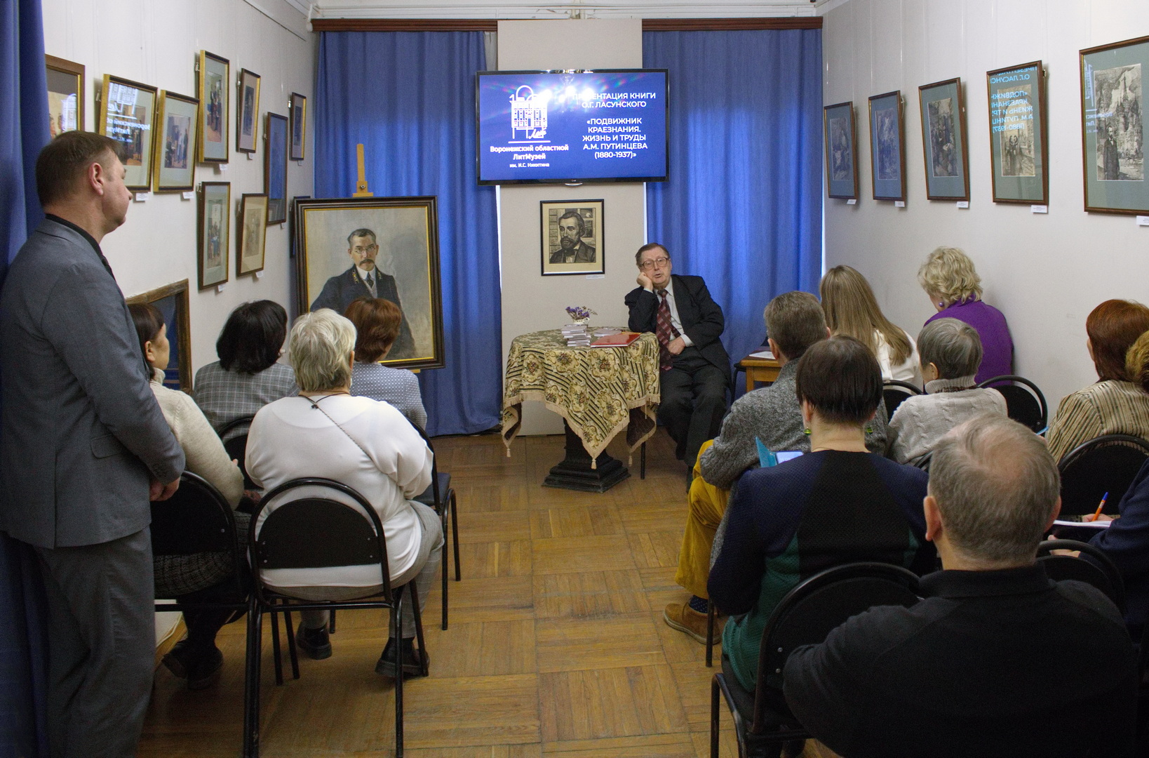 Увлекательную презентацию провел своей книги провел Олег Ласунский. Он познакомил гостей с биографией Путинцева, рассказал о знакомстве с его дочерью – Марией и ее супругом, академиком Павлом Черенковым. В радушной интеллигентной семье Олег Григорьевич гостил несколько дней и за это время многое узнал о личности первого директора Литературного музея Воронежского края. Воспоминания дочери, семейный архив Путинцева с его письмами, сборниками статей легли в основу книги об Алексее Михайловиче, который со студенческих лет увлеченно занимался изучением биографии и творчества поэтов Алексея Кольцова и Ивана Никитина. Подходил к этому очень основательно, штудировал архивы, собирал информацию из всех возможных источников. Кроме этого, он увлекался народным творчеством – во время фольклорных экспедиций записал более 1600 частушек и одним из первых заговорил о том, что этот жанр достоин научного изучения.