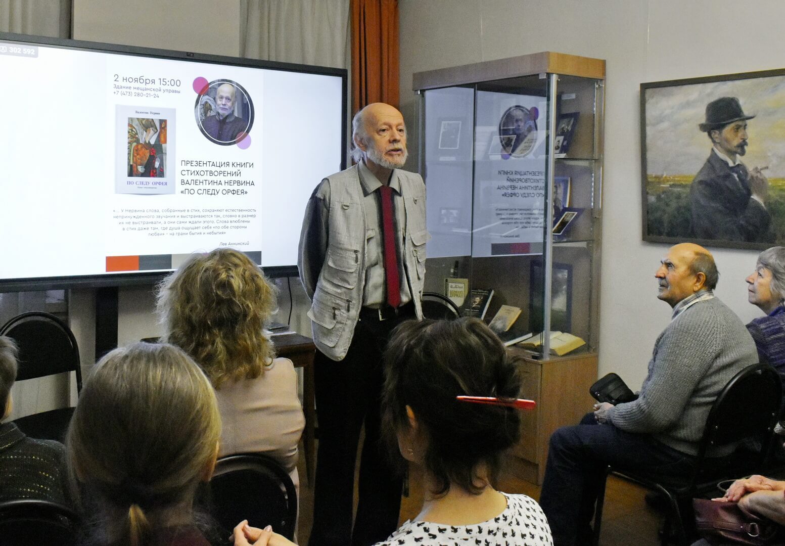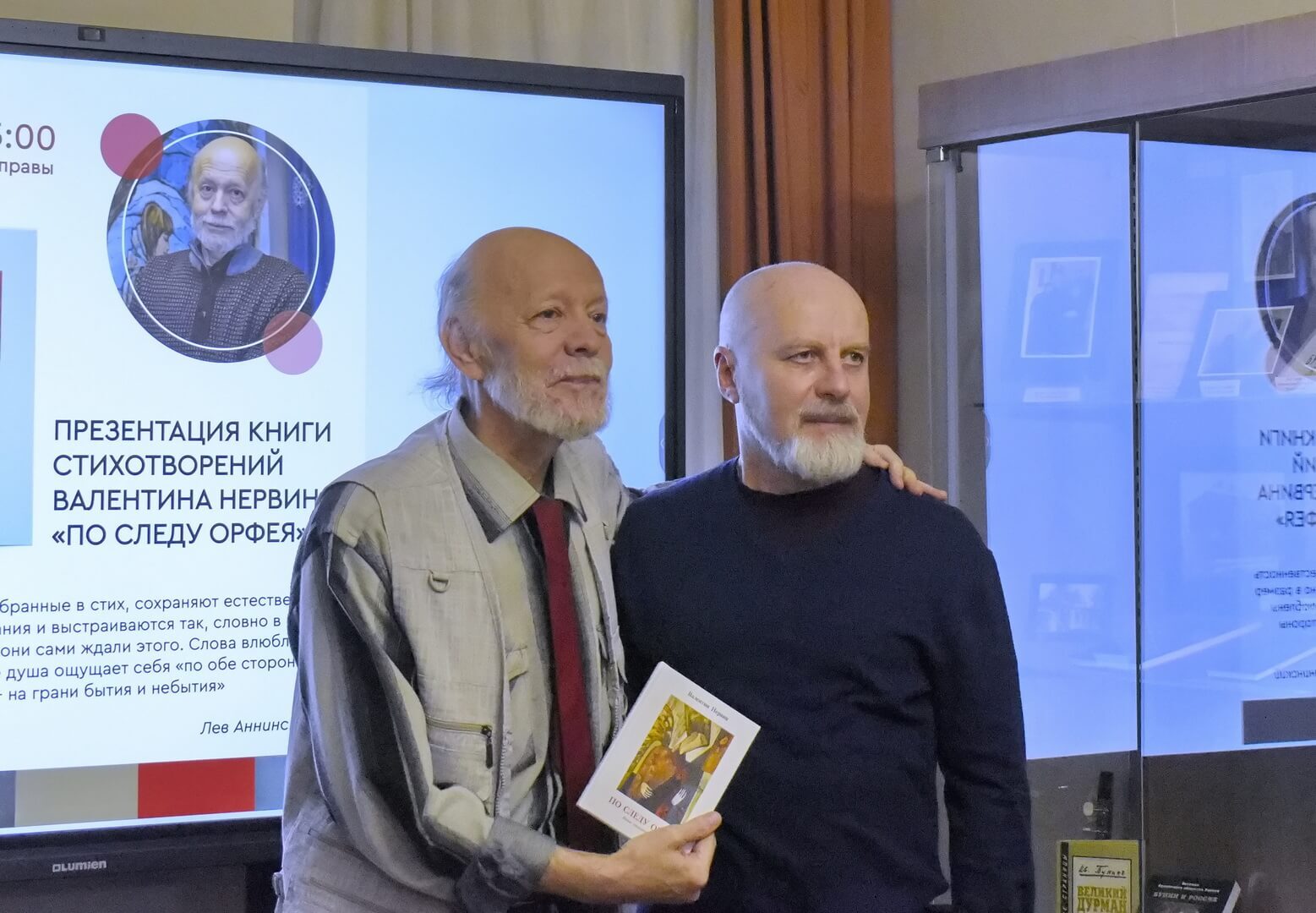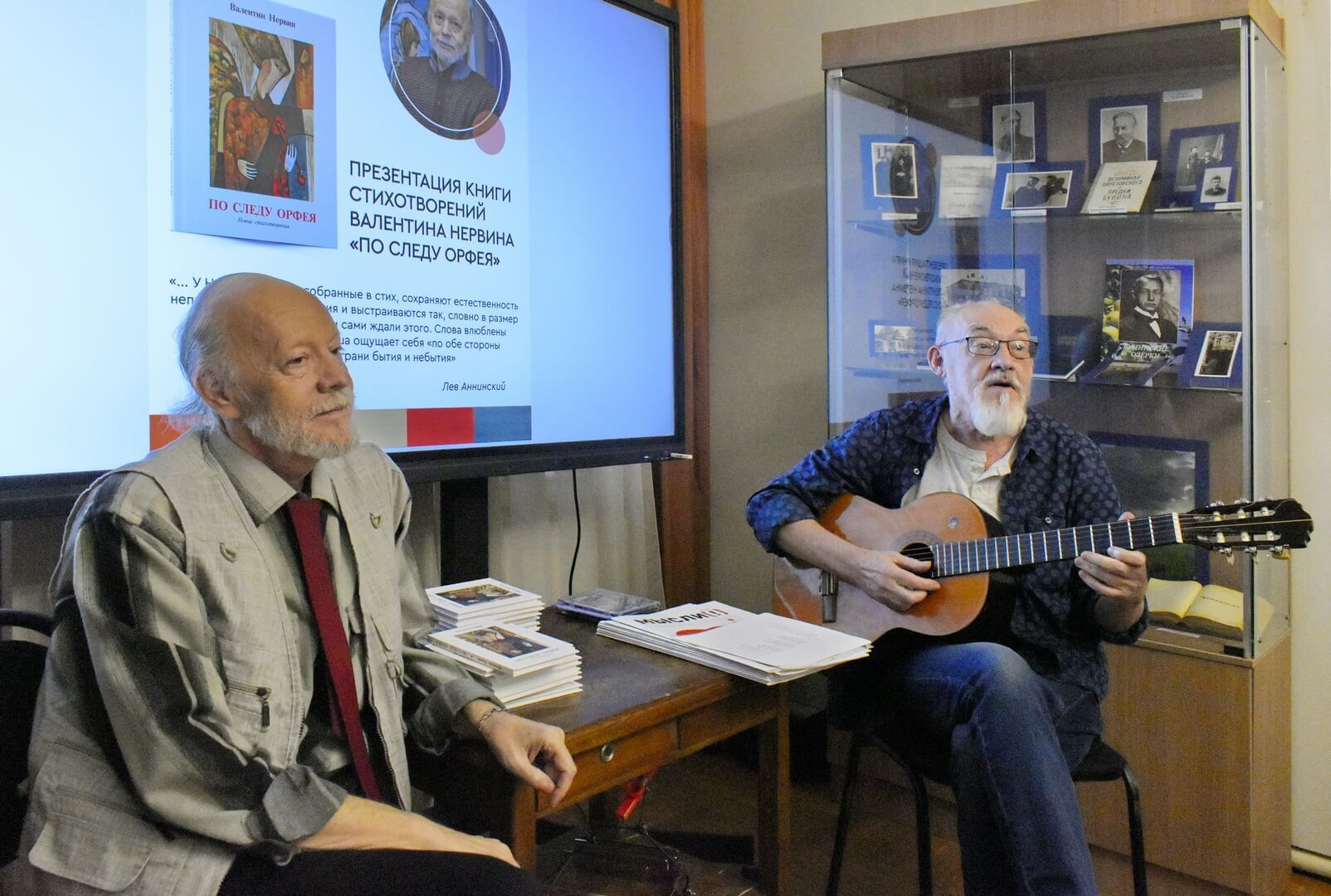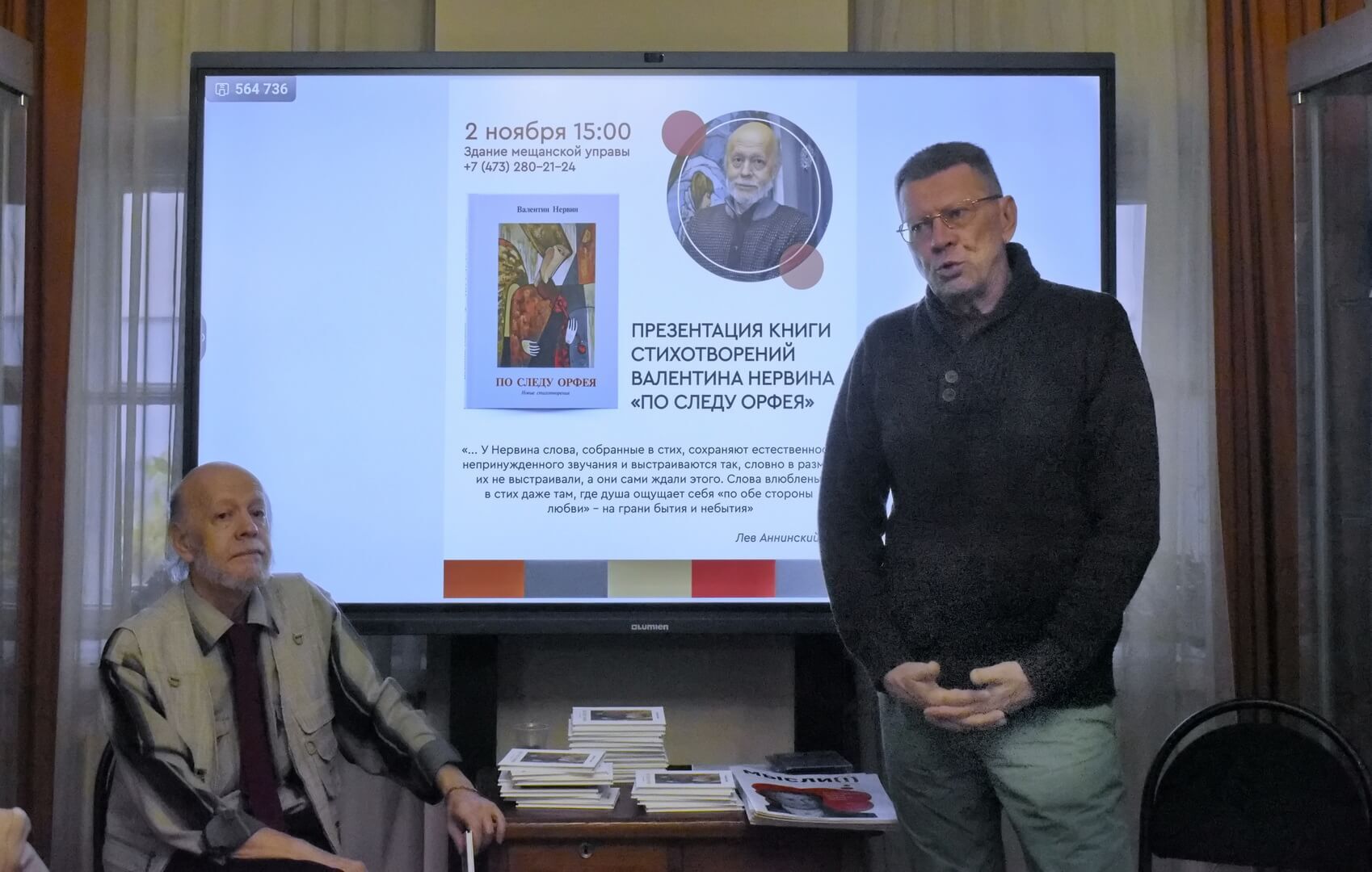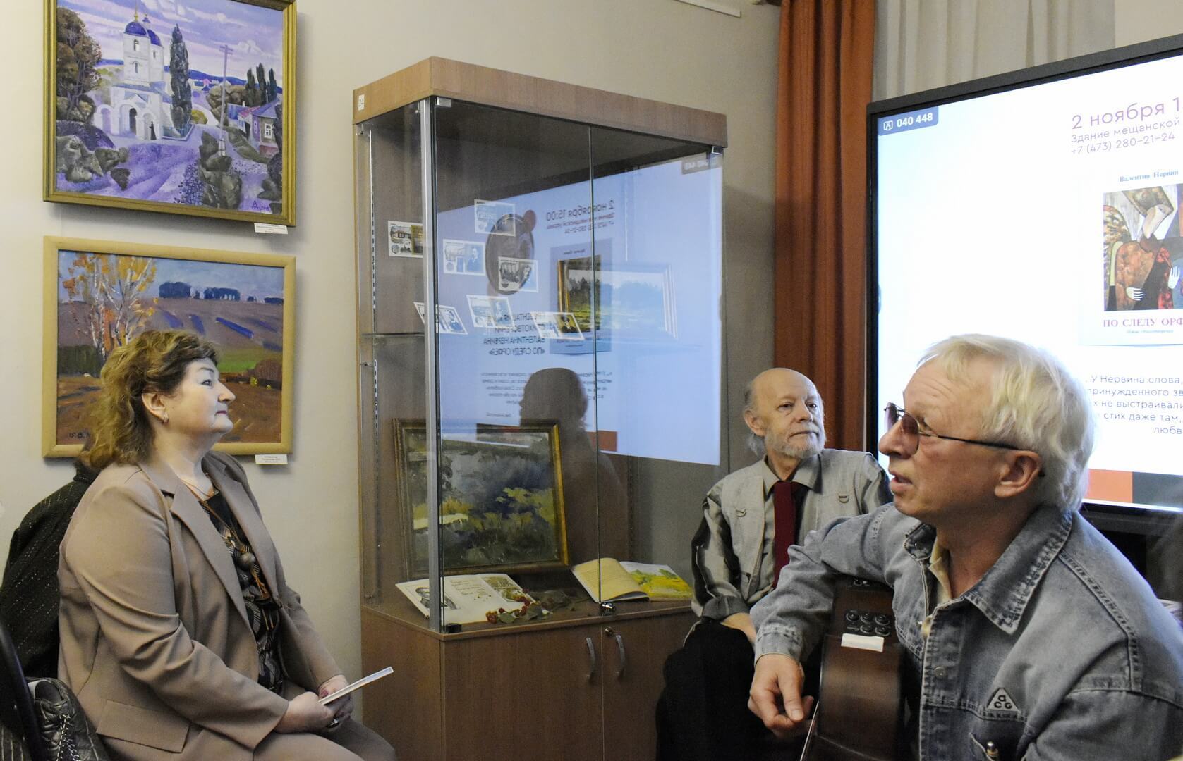 Дружеский тон встрече сразу задал писатель Александр Бунеев. Литературный редактор представил свежий номер культурно-просветительской газеты «Мысли» с юбилейным приветствием к автору (в августе Поэту Нервину исполнилось 70 лет) и рецензией на новый сборник «По следу Орфея» к.ф.н., доцента по кафедре стилистики и литературного редактирования факультета журналистики ВГУ Людмилы Сандлер. К радости всей публики удалось услышать и стихотворение-посвящение из уст Бунеева, и литературоведческий экспромт Сандлер по основным темам книжки.