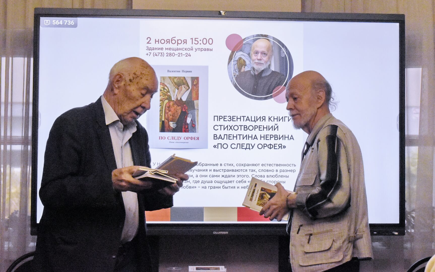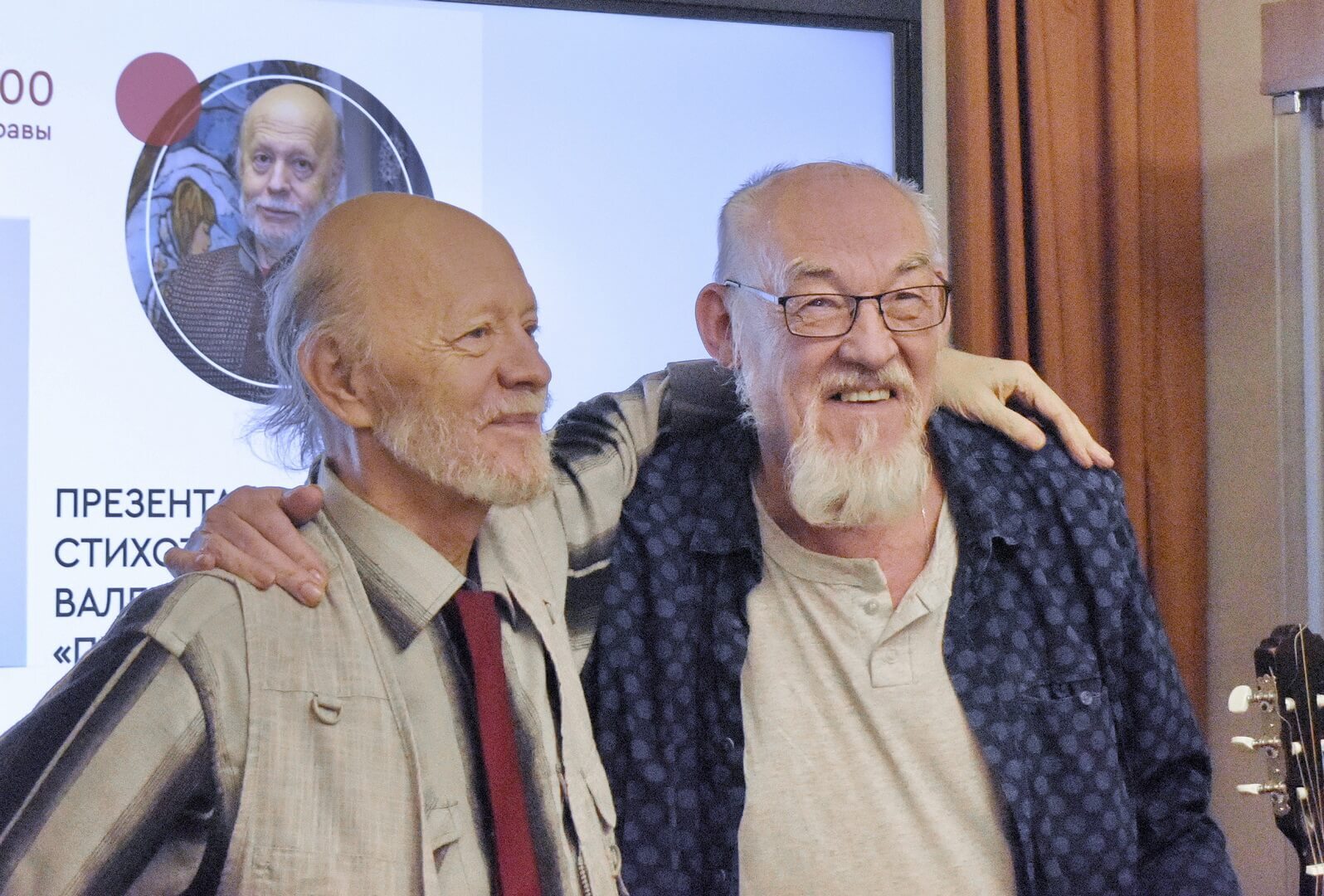 Подготовленная таким образом аудитория тепло встречала музыкальные фрагменты из программы на стихи Валентина Нервина в исполнении задушевного барда Сергея Олейника и непревзойденного музыканта, давнего друга, соавтора 5 музыкальных пластинок Олега Пожарского. Искренними и душевными аплодисментами награждали автора за прочтенные стихи многочисленные благодарные зрители.