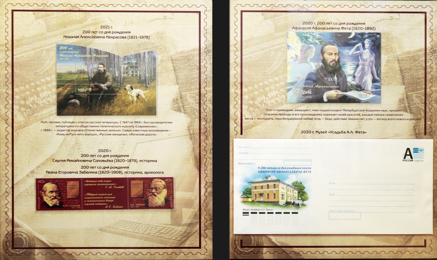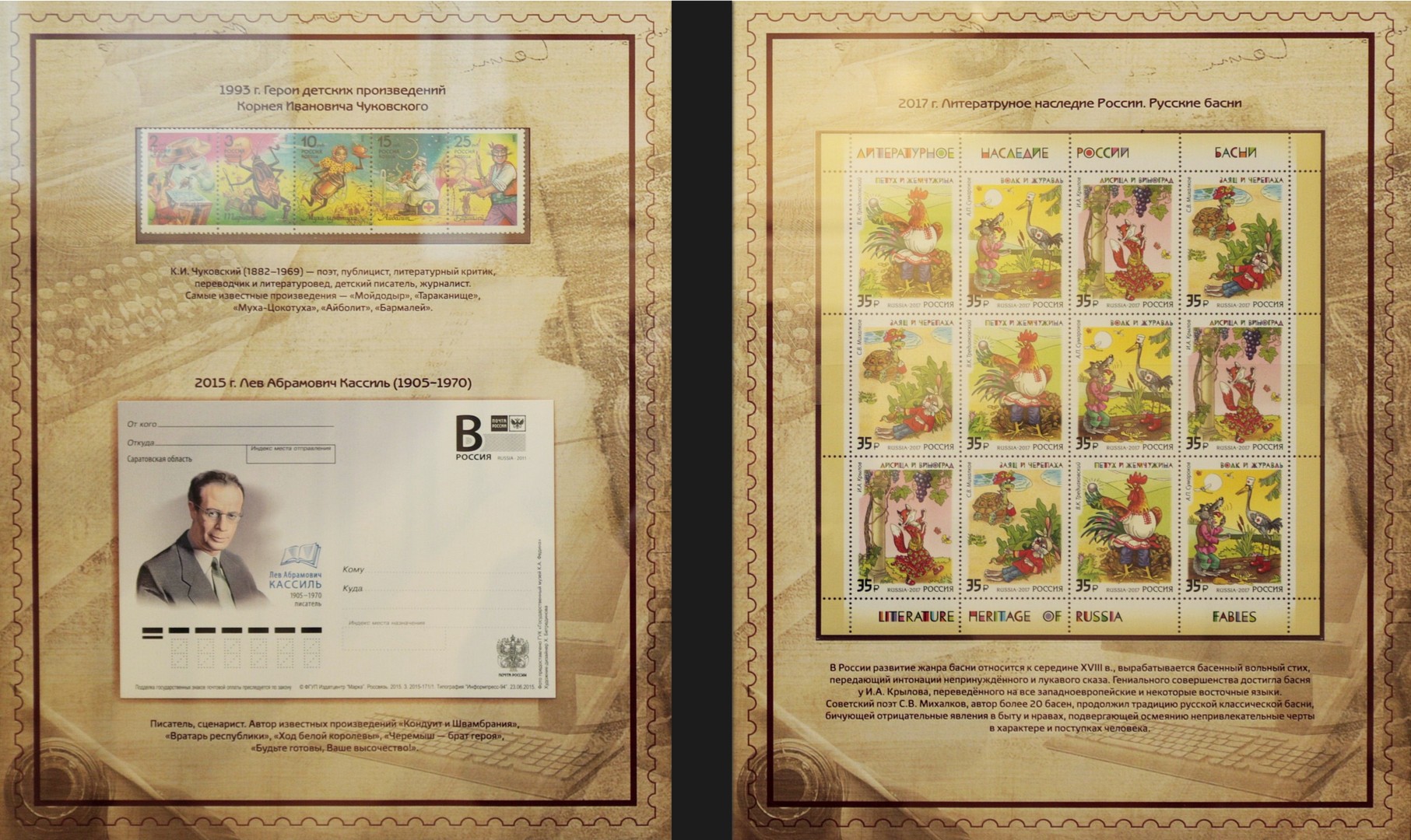 Россия как страна с огромным литературным наследием, регулярно печатает марки, посвященные известным авторам – они пользуются большой популярностью у коллекционеров филателистического сообщества. На тематической выставке представлены оригинальные художественные марки разных видов и форм, почтовые блоки, иллюстрированные маркированные конверты, почтовые миниатюры, посвященные Л.Н. Толстому, Н.В. Гоголю, Ф.М. Достоевскому, А.И. Куприну, И.А. Бунину, М. Кариму, Ф.Г. Алиевой и многим другим.