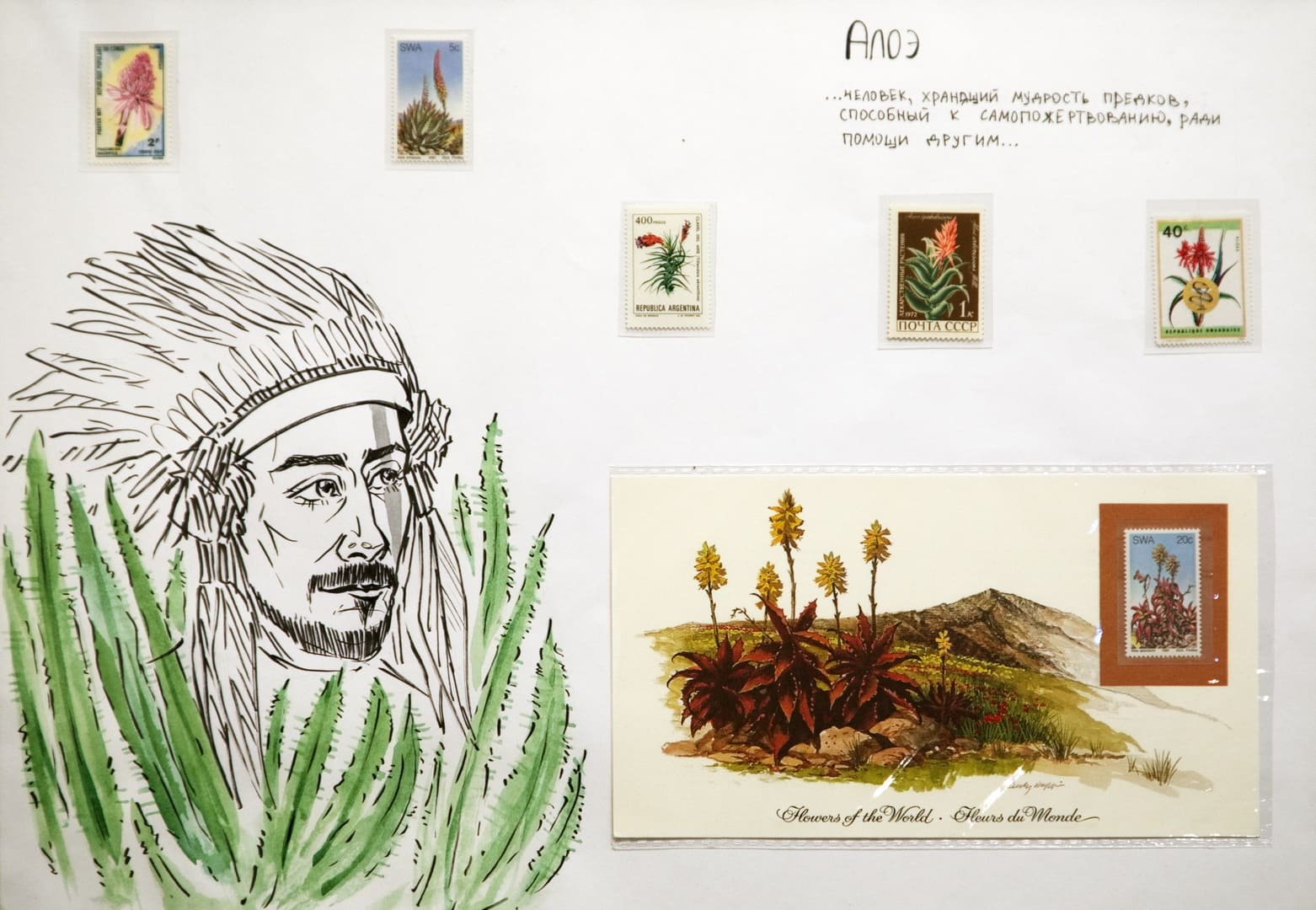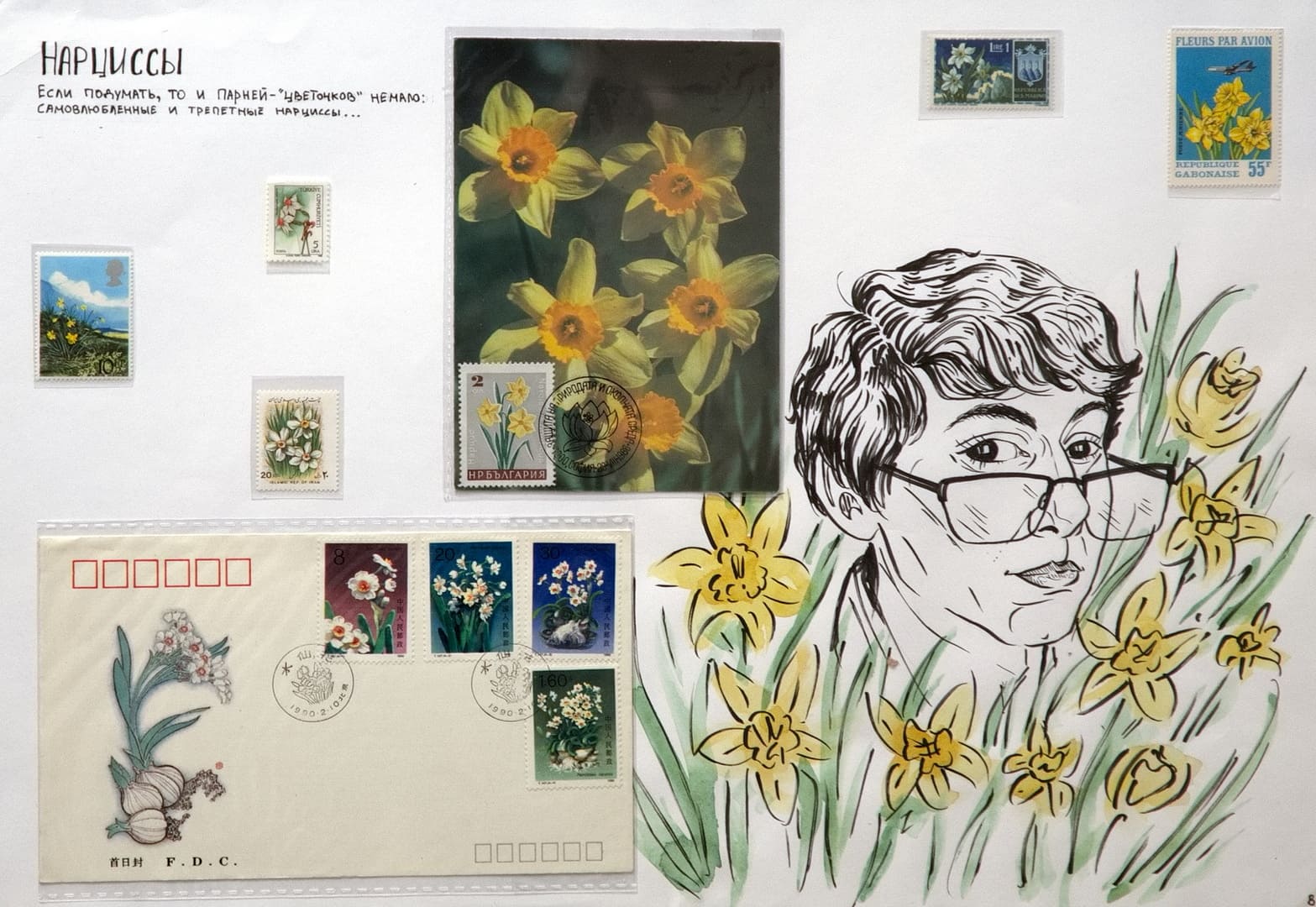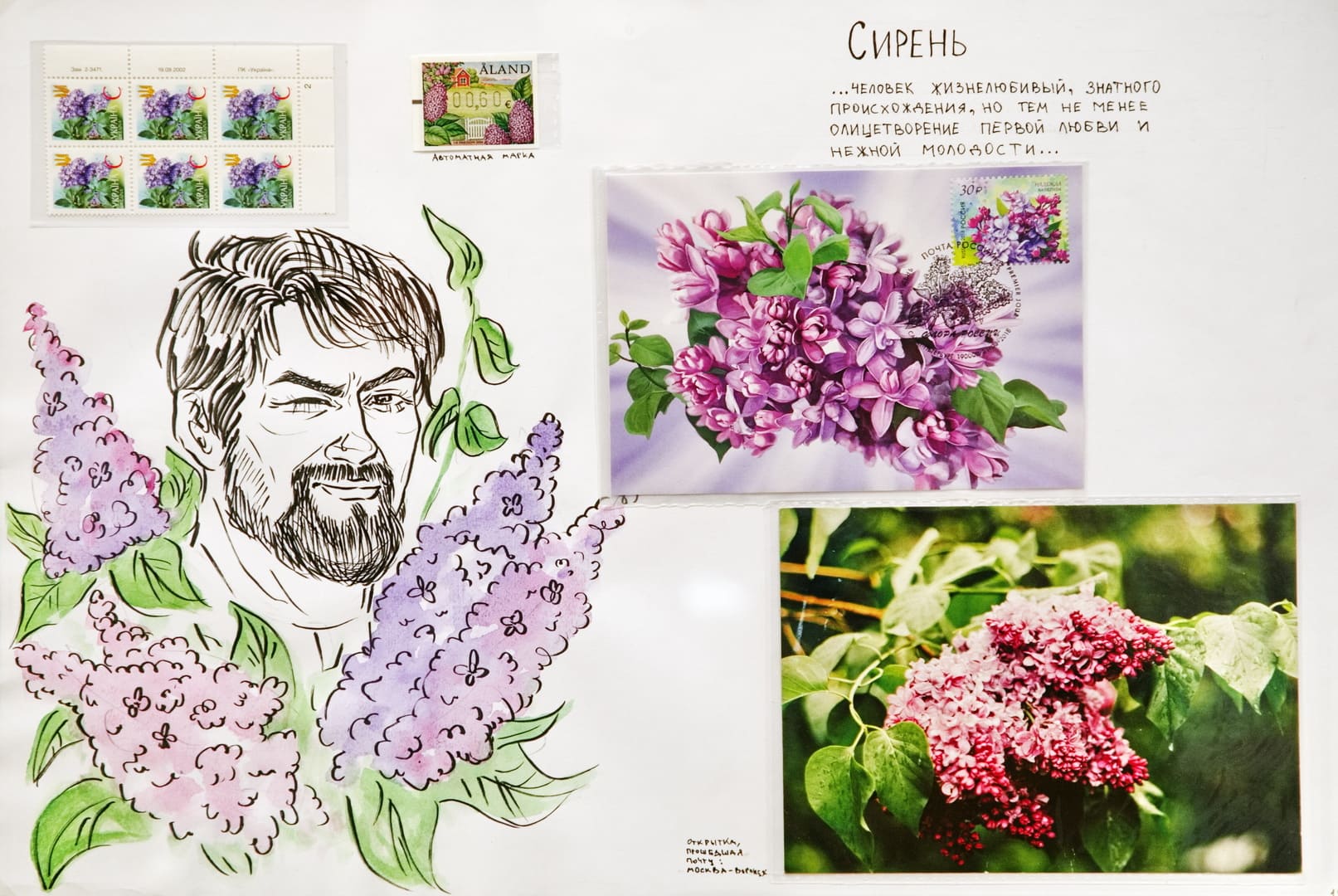 Теперь эта работа представлена в литературном музее. В проекте «Люди как цветы» показана вся палитра филателистических материалов: марки и блоки, карточки, картмаксимумы, конверты и листы первого дня, художественные штемпеля специального гашения. Изюминкой выставки является то, что марки с изображением цветов расположены не на однотонном поле, а на листах с портретами значимых для Анастасии людей. Рисунки выполнены автором экспозиции.