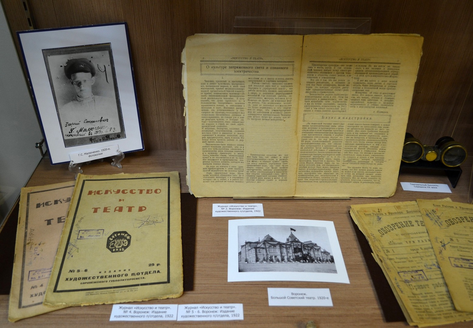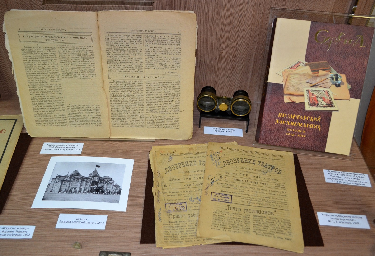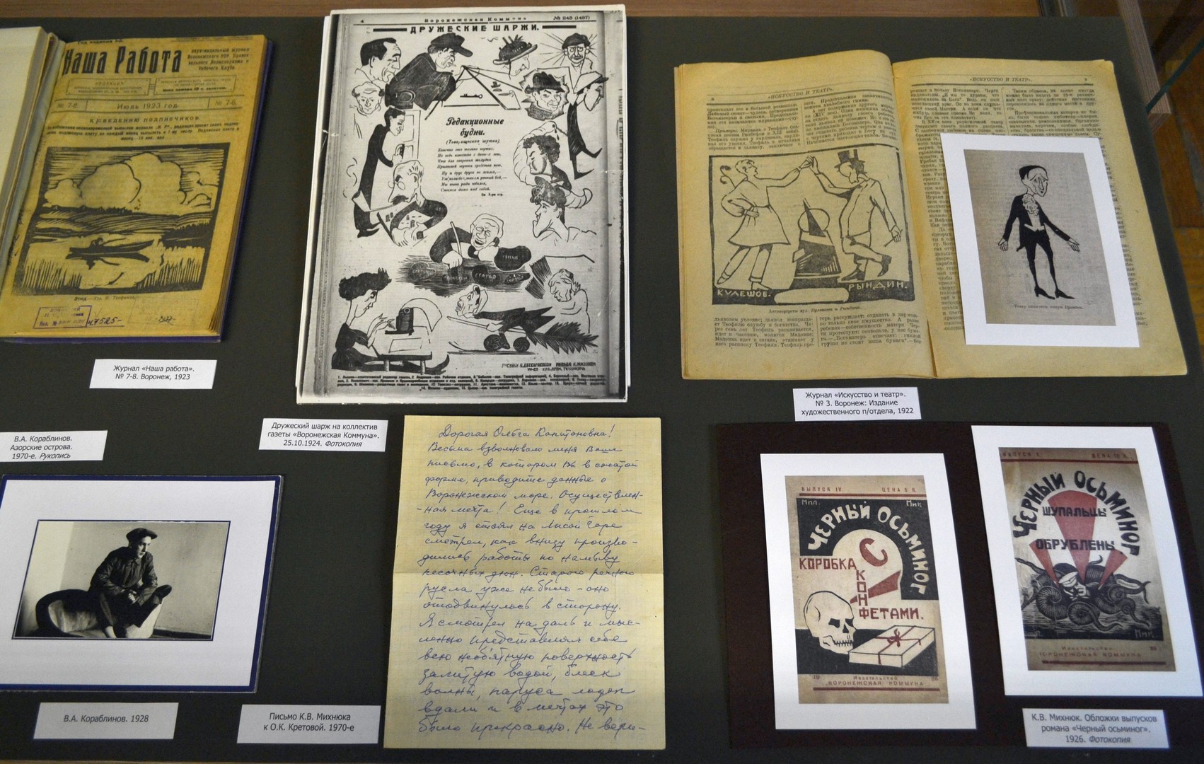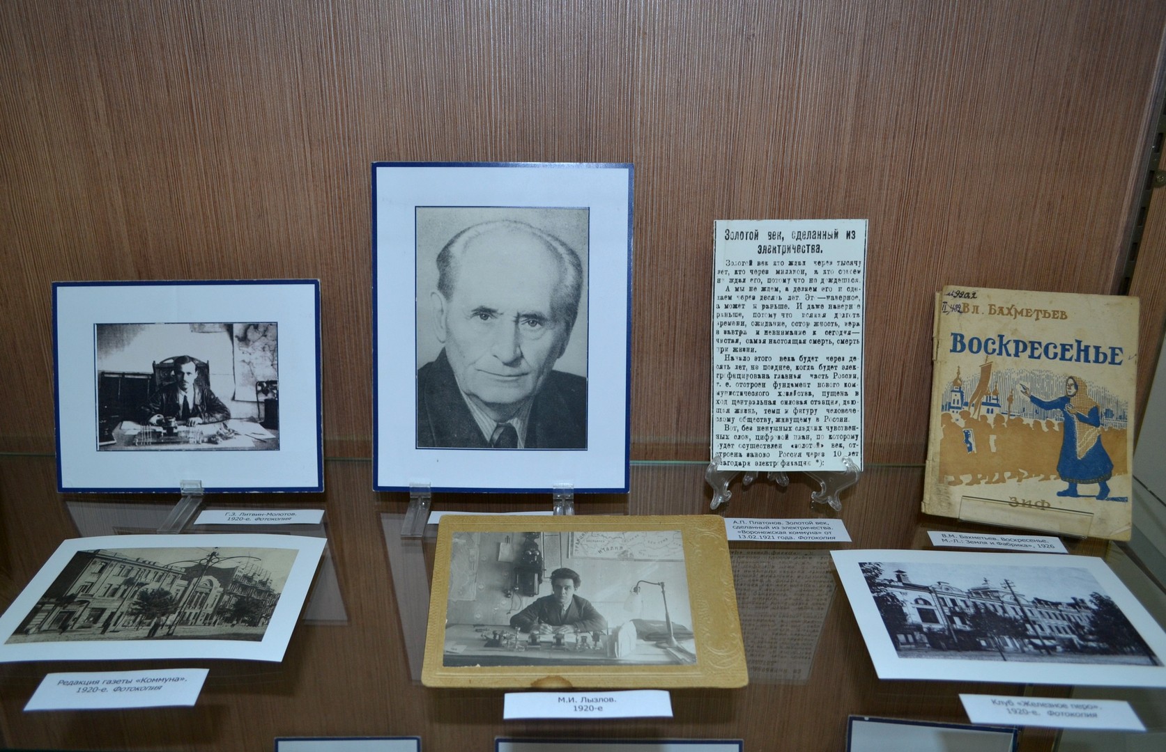 Экспозиция знакомит с жизнью и деятельностью друзей и коллег Андрея Платоновича – воронежских журналистов, писателей и поэтов. Первый раздел посвящен старшим товарищам и наставникам литератора, в разное время работавшими главными редакторами газеты «Воронежская коммуна» – Андрею Шестакову, Михаилу Лызлову, Георгию Литвину-Молотову. В витринах представлены их фотографии, редкие прижизненные издания книг, написанных на воронежском материале, подлинный выпуск газеты за 1923 год. Другие разделы рассказывают о самых ярких и талантливых молодых воронежских журналистах 1920-х годов – Михаиле Бахметьеве, Андрее Новикове, Георгии Плетневе, Владимире Келлере, Георгии Малюченко. Представлены подлинные выпуски журналов «Зори», «Искусство и театр», «Наша работа», в которых печатались их статьи, рассказы и стихи, наряду с произведениями Андрея Платонова. Отдельный блок посвящен творчеству воронежских художников, украсивших страницы этих изданий своими гравюрами.