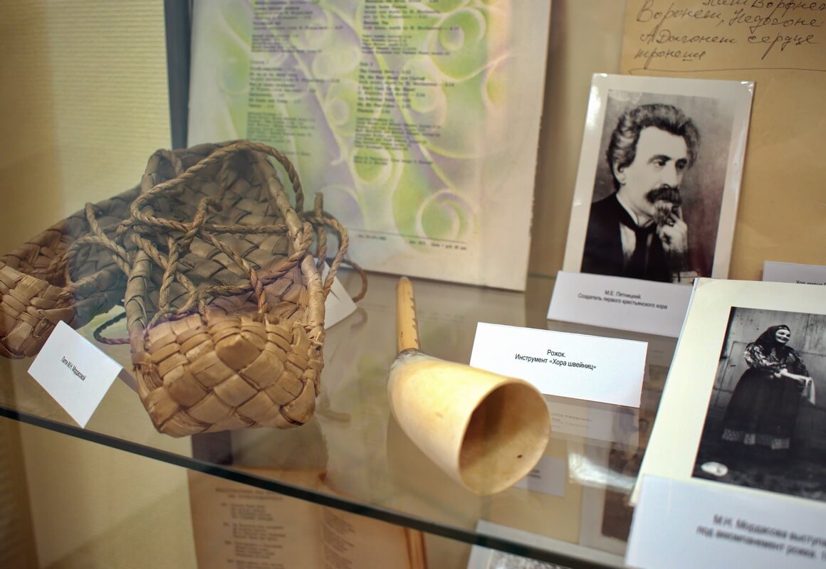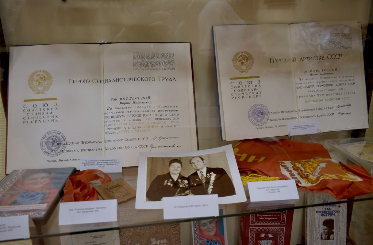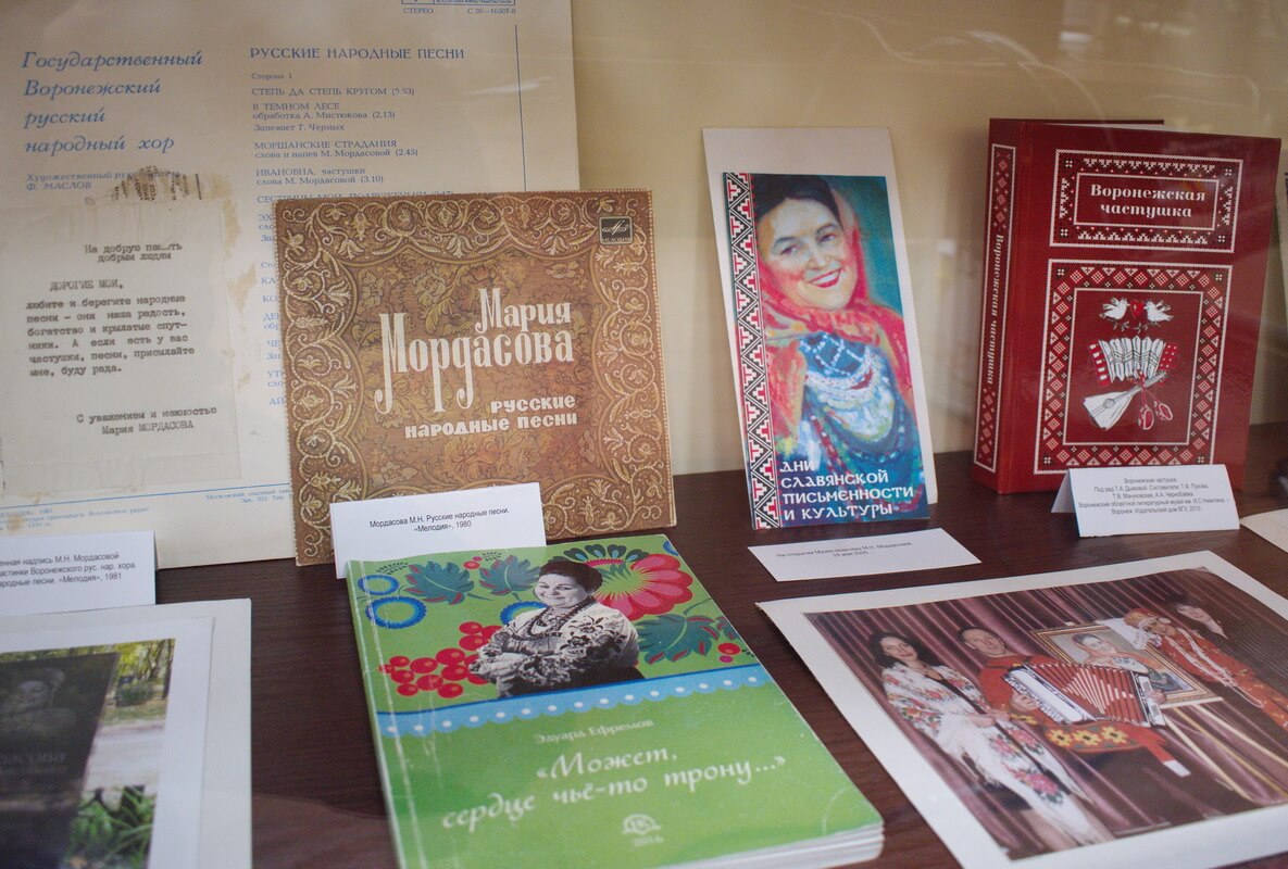 В Музее инженерного дела ВГТУ состоялось открытие выставки литературного музея имени И.С. Никитина «Частушечные узоры». Она подготовлена к 105-летию со дня рождения М.Н. Мордасовой и знакомит с биографией и творчеством «королевы частушки». Открывая выставку, научный сотрудник Музея имени И.С. Никитина Екатерина Агеева в своем рассказе выделила главную особенность её концепции — переплетение творческой биографии певицы с историей и культурой страны. Презентация экспозиции началась с показа отрывка из документального фильма «Когда Мордасова поет…». Подлинный сценический костюм Марии Николаевны, в котором она поёт в киносюжете, был предоставлен для вернисажа Воронежским государственным русским народным хором, где Мордасова проработала около 30 лет. О детстве и юности Марии Мордасовой на выставке фрагментарно говорят копия её метрической книги, подлинные фотографии, книги, типологические предметы быта ХХ века. Начало творческой биографии певицы показано фотоснимками хора Воронежской швейной фабрики имени 1Мая, вошедшего в историю как «Хор швейниц», музыкальными инструментами, а также документами об организации Воронежского государственного народного хора, о легендарном танке «Русская песня». Долгая совместная семейная и сценическая жизнь Марии Николаевны с Иваном Руденко представлены уникальными книжными изданиями, личными сувенирами, грамотами, и грампластинками. Три копии концертных костюмов, которые можно увидеть на выставке – это всего лишь малая часть коллекции, хранящейся в музее-квартире М.Н. Мордасовой – подразделении литературного музея. Дополняют экспозицию стенды. На них, помимо фотографий, размещены тексты песен и частушек Марии Николаевны. Вернисаж завершило выступление учеников Воронежской ДШИ № 13 Марии Чуб, Анны Дзиндзёры и Артема Разуваева и звучание голоса Марии Мордасовой из патефона с грампластинки 1955 года. Выставку можно посмотреть по 18 июня в Музее инженерного дела ВГТУ по адресу: Воронеж, Московский проспект, д.14, ауд.114. Справки по телефонам: 89155863556, 89601165192