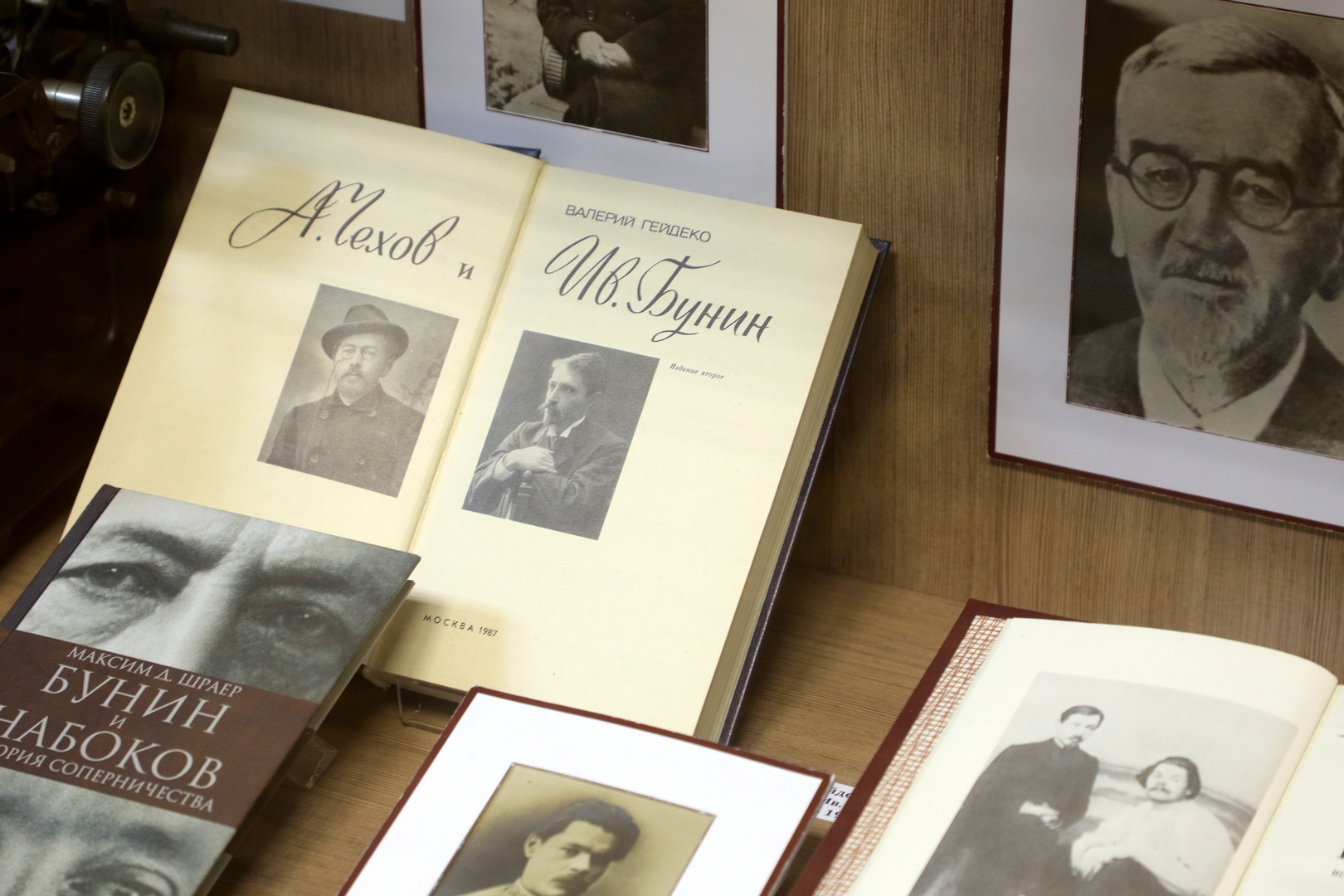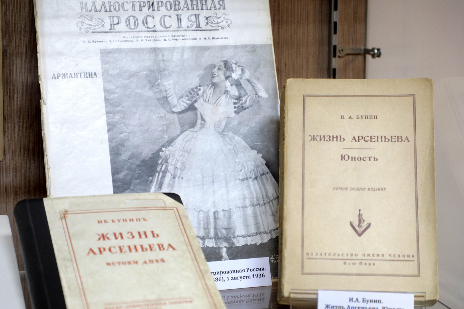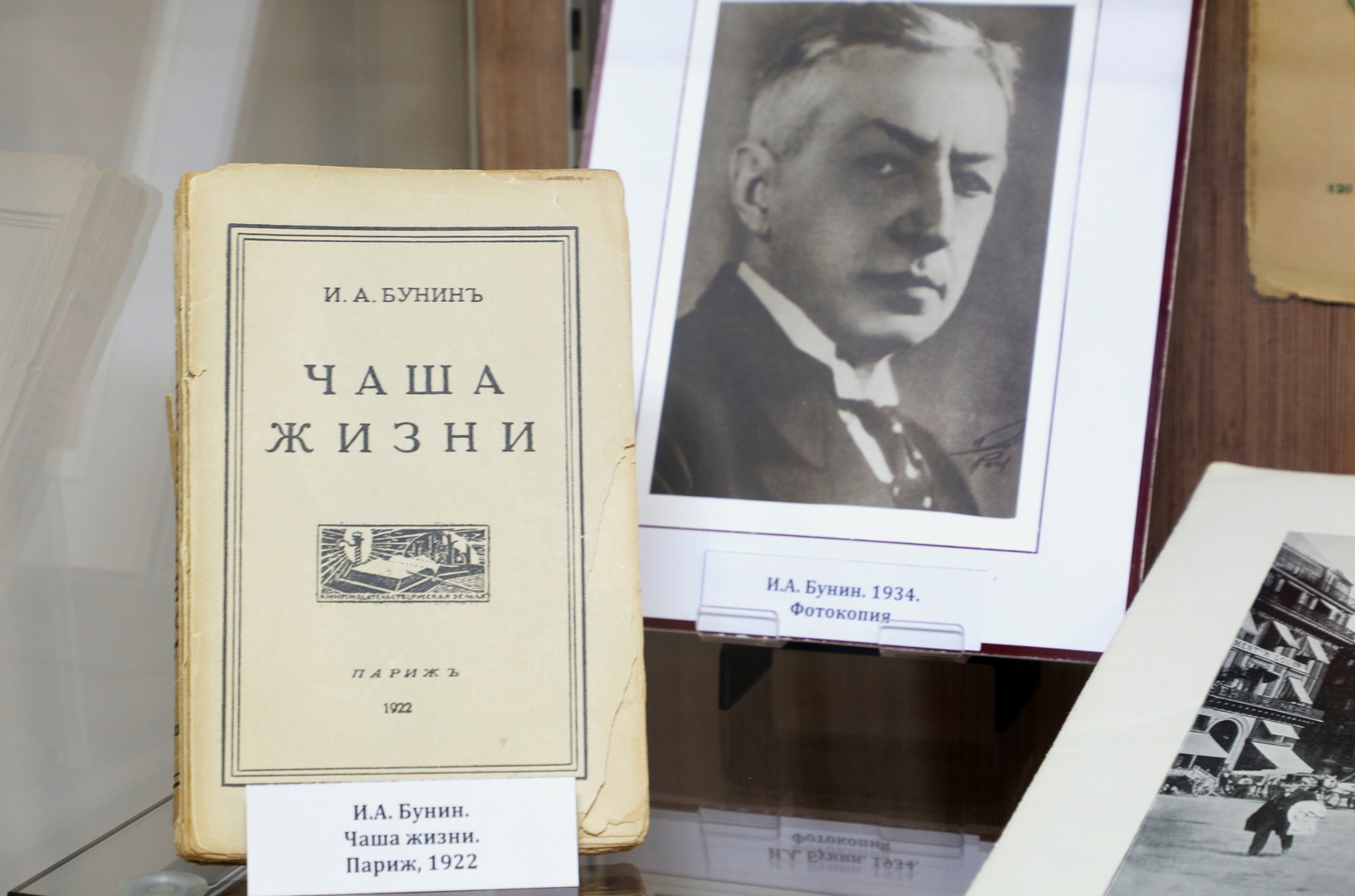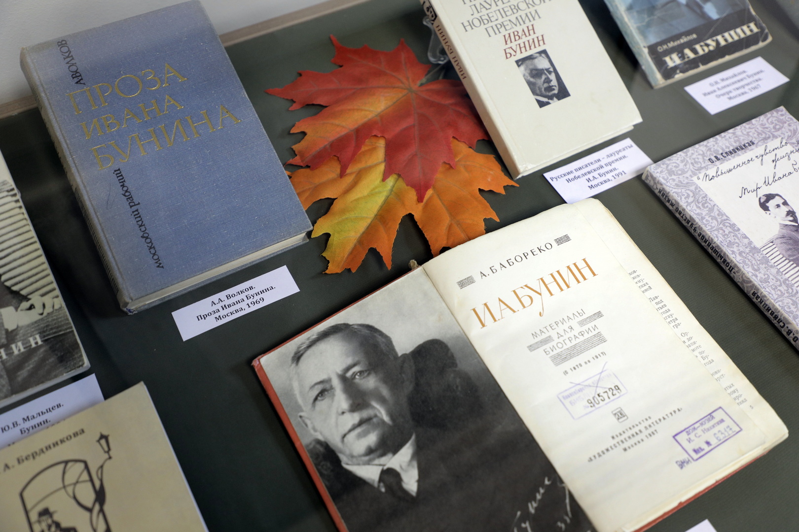 В экспозиции представлены прижизненные издания произведений классика, оригиналы его писем, редкие фотографии. В числе ценных экспонатов – несколько томов из полного собрания сочинений И.А. Бунина 1915 года, парижские издания сборника рассказов «Чаша жизни» (1922) и первой части романа «Жизнь Арсеньева» «Истоки дней» (1930), один из номеров эмигрантского журнала «Иллюстрированная Россия» за 1936 год. Отдельное внимание уделено переводам произведений лауреата Нобелевской премии на разные языки мира, а также трудам советских и российский учёных, содержащим фундаментальный анализ его творчества. Дополняют выставку работы современных художников Александра Лаврова, Олега Савостюка и Николая Кожуховского.
