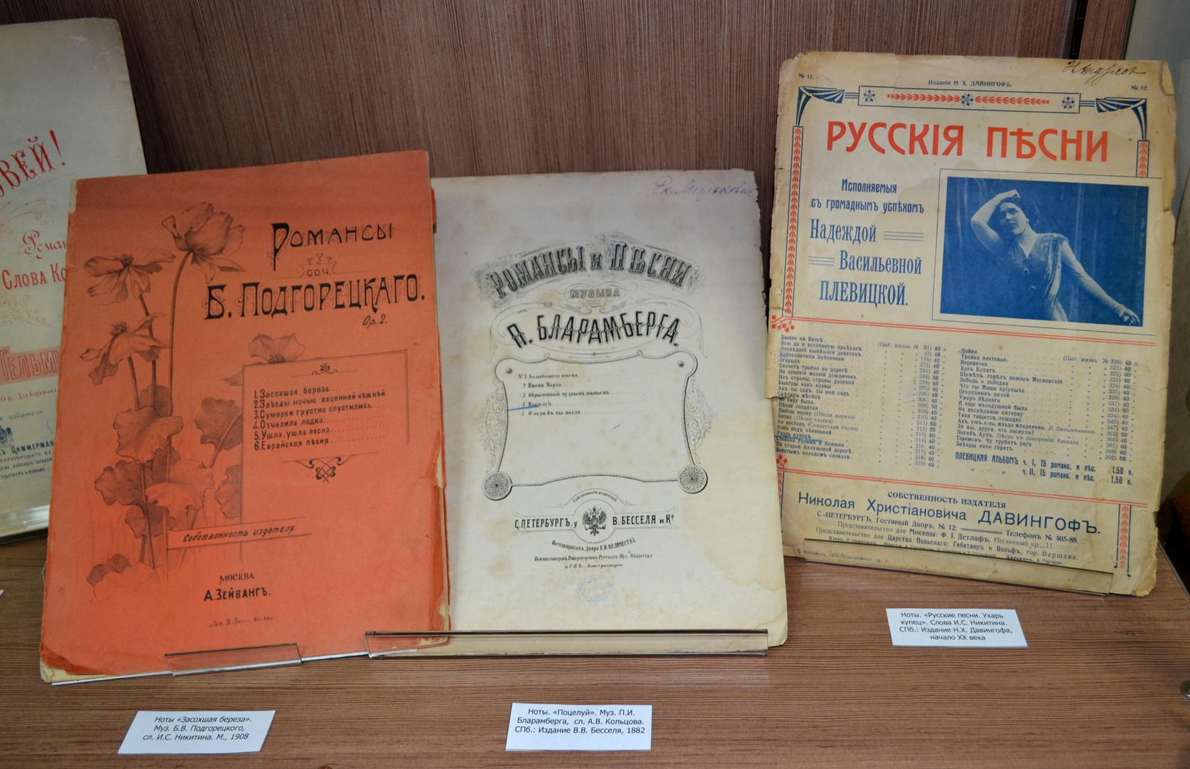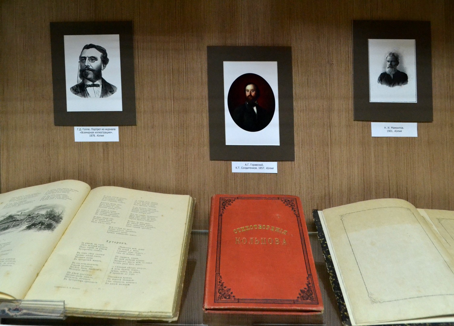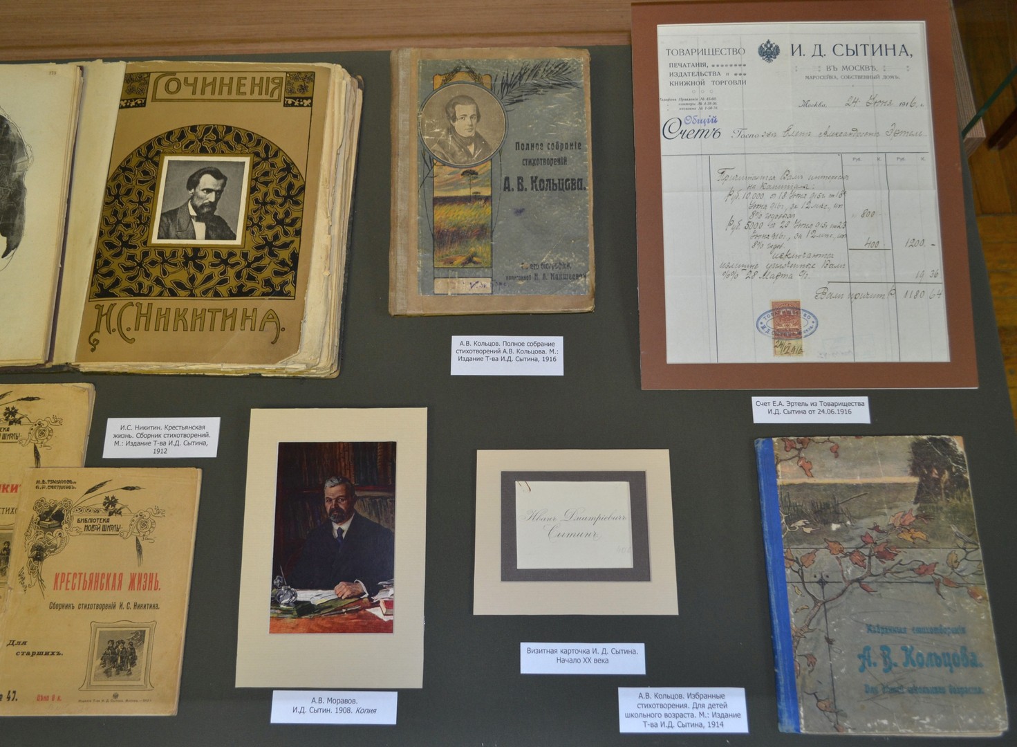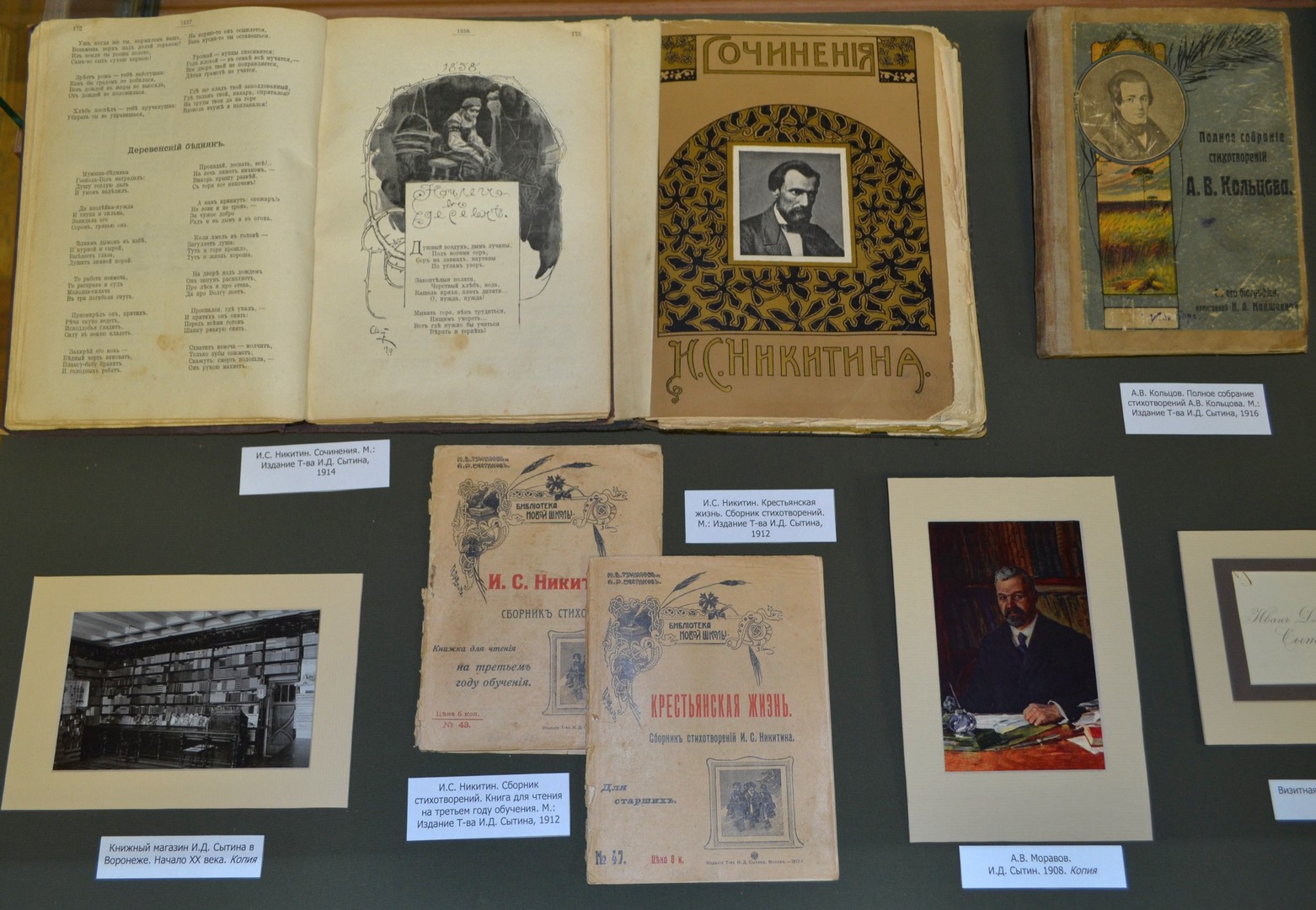 В пространстве выставки представлены также первые сборники полных собраний сочинений А.В. Кольцова и И.С. Никитина, ставшие сейчас библиографической редкостью. Отдельный раздел посвящен музыкальным издателям, выпускавшим ноты и провинциальным русским издательствам. Большой интерес вызывают подлинные документы, связанные с книготорговлей начала ХХ века: счета и накладные книжных магазинов, визитки, рекламные проспекты. Художественным дополнением выставки служат иллюстрации к произведениям И.С. Никитина и А.В. Кольцова.