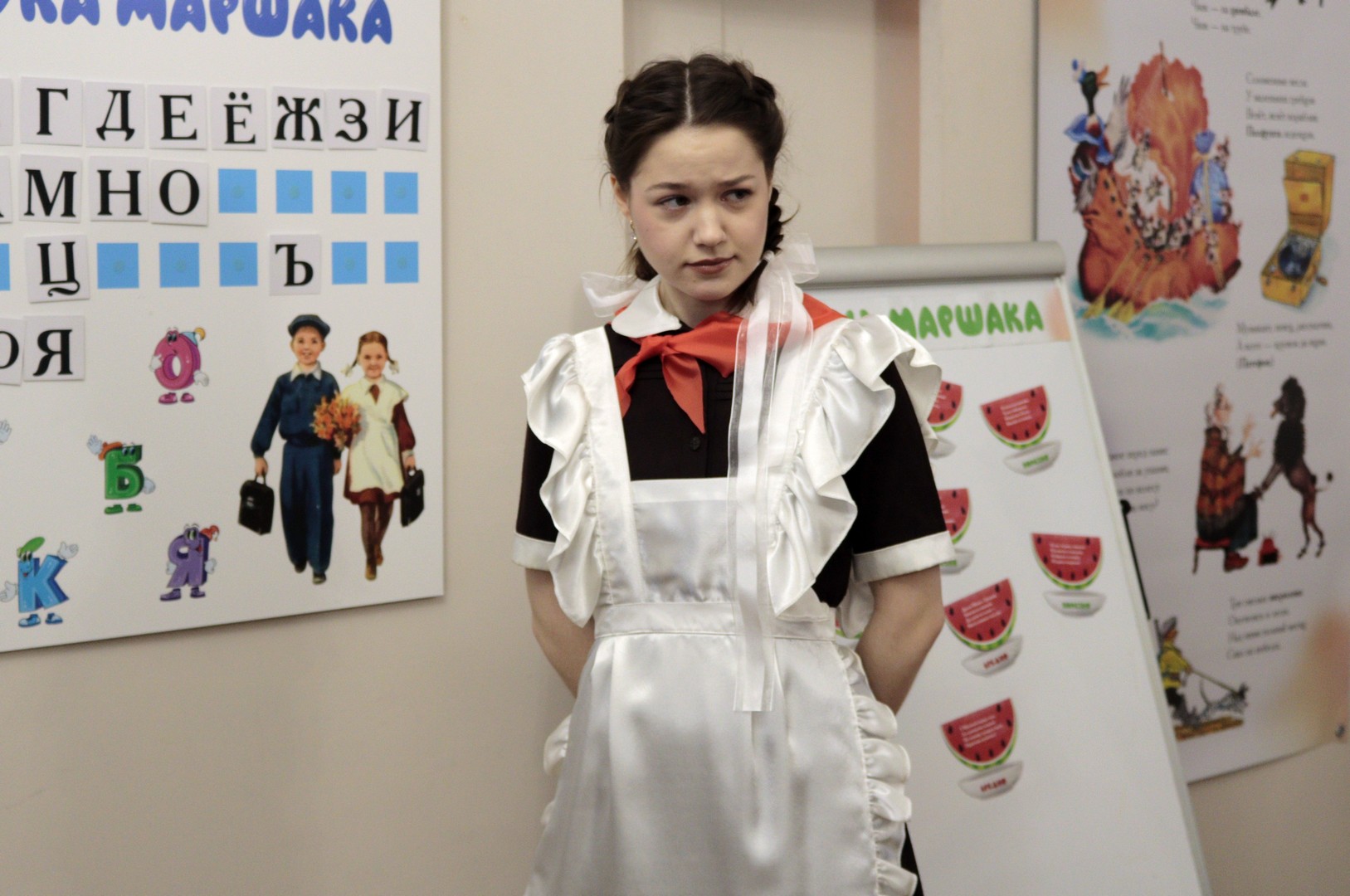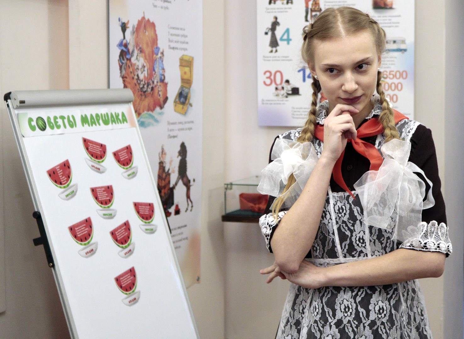 Затем прозвенел звонок, означающий, что пора на занятия! Вместе с прилежной ученицей-пионеркой Наташей и ленивой школьницей Аней дети посетили уроки математики, географии и пения. В увлекательном интерактивном формате юные гости познакомились со стихотворениями Маршака. Оригинальная особенность выставочного пространства в том, что каждое произведение писателя представлено в виде игрового модуля и отражает один из школьных предметов. Весело, с большим удовольствием ребята сыграли в математическое лото, попутешествовали по карте Советского Союза, разобрались с географическими названиями и поучаствовали в музыкальной викторине. Так дети доказали школьнице Ане, что учиться очень интересно, и она, в свою очередь, пообещала не опаздывать на уроки и получать только «пятерки».