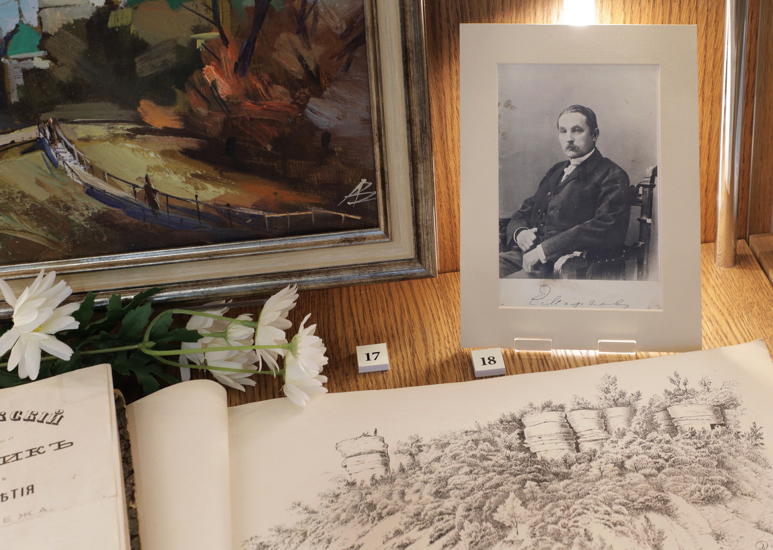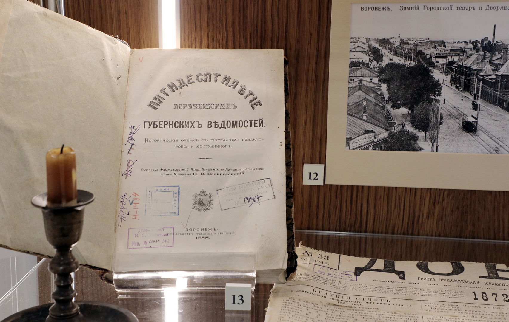 27 сентября в Доме-музее И.С. Никитина состоялось торжественное открытие литературно-документальной выставки «Книжная история Воронежской губернии», посвящённой 300-летию со дня основания Воронежской губернии. На ней представлены редкие книги и периодические издания XIX – начала ХХ веков, а также современные исследования, проливающие свет на важные вехи истории Чернозёмного края. В числе экспонатов демонстрируются оттиски из «Памятных книжек Воронежской губернии» 1890-х годов, номера журнала «Филологические записки» 1870-1880 годов, выпуски газет «Воронежские губернские ведомости» 1880-х годов и «Воронежский телеграф» 1900-х годов, а также уникальный альбом историка Леонида Вейнберга «Очерк замечательных древностей Воронежской губернии» (1891 г.), содержащий роскошные иллюстрации краеведа Евгения Маркова. Отдельное внимание уделено рисункам и открыткам, изображающим природу, архитектуру и население Воронежской губернии.