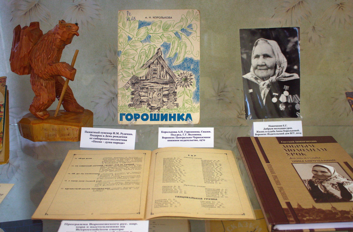В музее-квартире М.Н. Мордасовой открылась выставка «Литературные самородки Воронежского края». Она приурочена к Году народного творчества и представляет четыре имени, в разное время прославившие Воронеж в поэтическом, сказочном и песенном творчестве, — это А.В. Кольцов, А.К. Барышникова, А.Н. Королькова и М.Н. Мордасова. Все они были собирателями народных песен, сказок, пословиц и поговорок, частушек, а их творчество стало мостиком, соединяющим традиции и современность. Раздел, посвященный Алексею Васильевичу Кольцову, представлен фоторепродукциями портретов поэта и его родителей, редким изданием 1910 года полного собрания стихотворений, фоторепродукциями картин воронежского художника М.И. Лихачева «Рождение песни. А.В. Кольцов», «Лошади. На Дону», а также предметами купеческого быта. Отдельный интерес представляет издание словаря «Крылатое слово А.В. Кольцова» издательства ВГУ. Следующая часть выставки рассказывает о русских сказочницах Анне Куприяновны Барышниковой (Куприянихи) и Анне Николаевны Корольковой. Здесь представлены сборники сказок, фотографии, биографические и научные издания, в том числе книга воронежского писателя Е.Г. Новичихина «Добрым молодцам урок. Жизнь и судьба Анны Корольковой». Работа в Воронежском хоре прославила Марию Николаевну Мордасову. Бережное отношение к живому слову, искренность, неподражаемая танцевальная манера и импровизация составляют индивидуальность ее образа. На выставке экспонируются фотографии семьи Марии Николаевны, ее первого учителя и первого самодеятельного коллектива, копии документов о создании Воронежского государственного русского народного хора. Выставка будет работать до 2 марта.