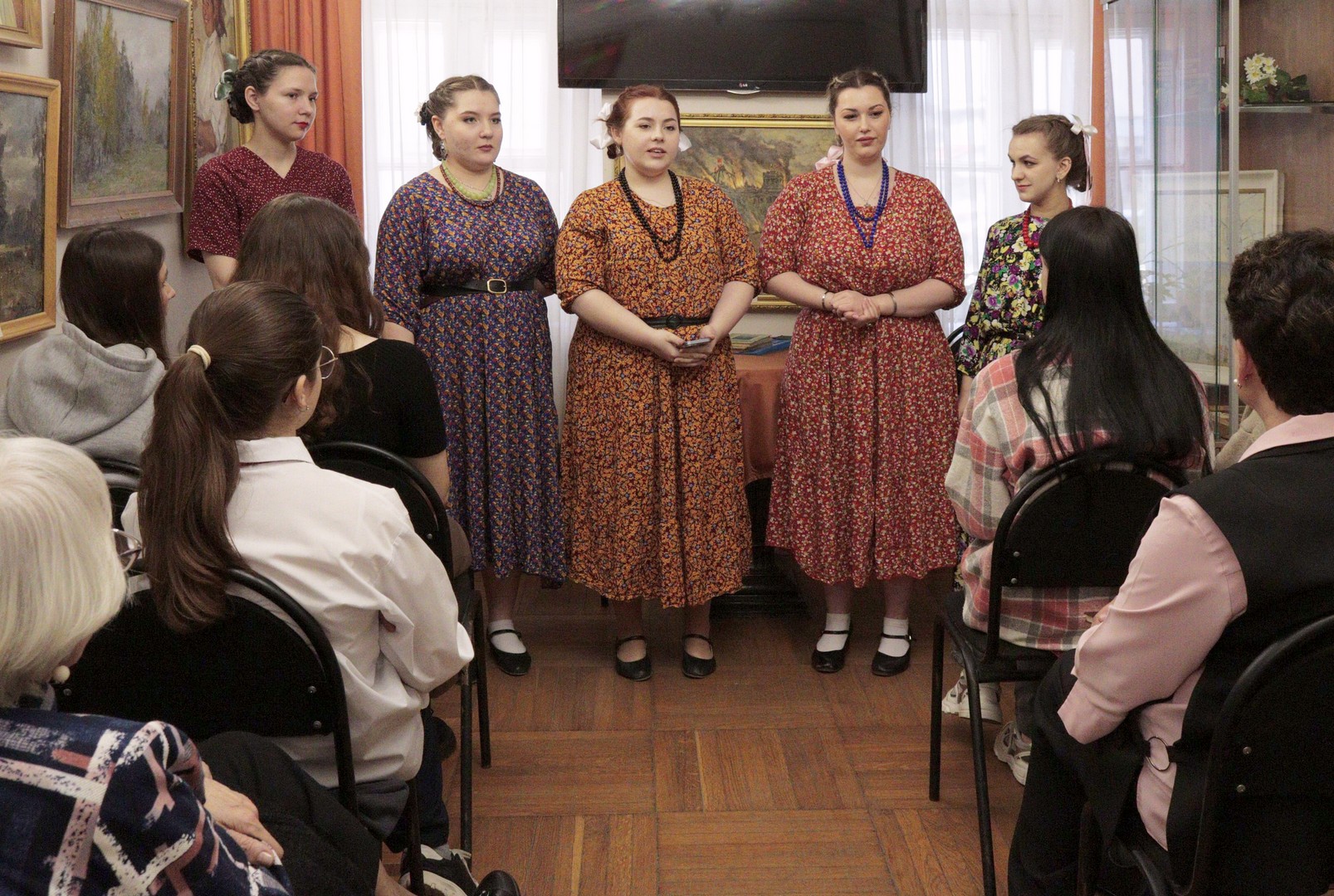 Программу открытия продолжил студенческий фольклорный ансамбль «Старинка» Воронежского государственного института искусств. Под аккомпанемент баяна и акапельно коллектив великолепно исполнил несколько народных песен военного времени. Примечательно, что девушки творчески подошли к выступлению, одевшись и сделав прически в духе 40-х годов, что безусловно создало эффект присутствия в той эпохе. Вдохновившись темой выставки, юные артистки проявили замечательную инициативу, прочитав гостям стихотворение участника Великой Отечественной войны. Оно является частью музыкально-этнографического спектакля «Дело было в Оскьино», подготовленного к 80-летию Победы профессором кафедры этномузыкологии ВГИИ Галиной Сысоевой и ее студентами.
