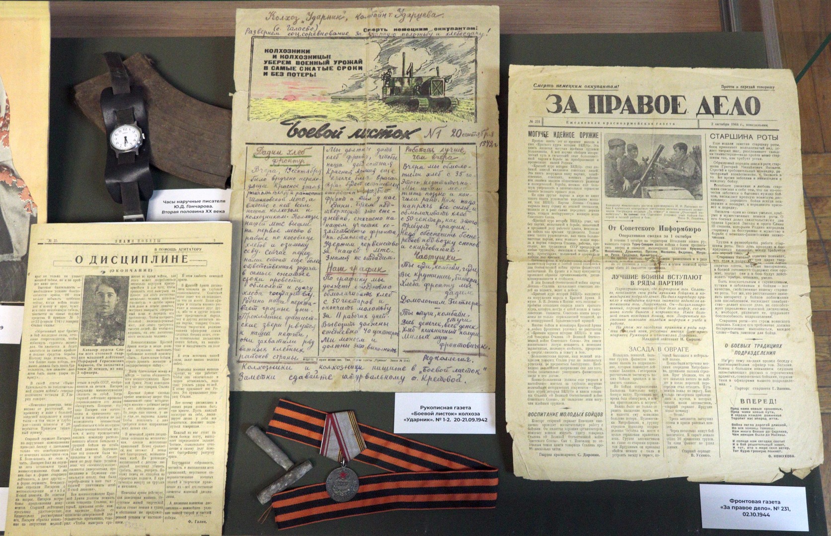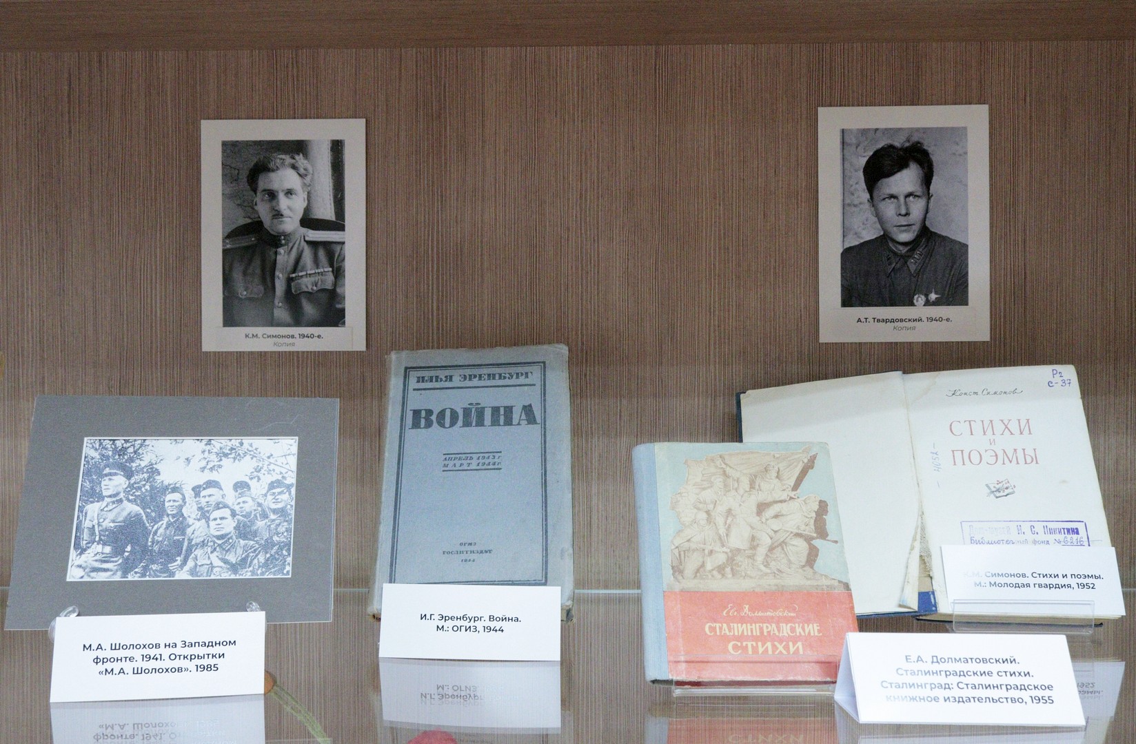 Особый интерес в экспозиции вызывают личные вещи писателей-фронтовиков, их письма и документы. Большую ценность представляют предметы в разделе военной хроники – рукописная газета «Боевой листок», выпущенная 20-21 сентября 1942 года колхозом «Ударник», красноармейская газета «За правое дело» 33-й Армии Западного фронта, журнал «Огонек» за 1944 год – каждое издание содержит информацию о продвижении советских войск, статьи и очерки о подвигах солдат, заметки о помощи тыла, военные литературные произведения. Привлекают внимание и редкие книги военного и послевоенного времени – «Под небесами Родины» Андрея Платонова, «Боевые эпизоды. Очерки и заметки из газет» Воронежского областного книгоиздательства, «Дед Гарнизон» Алексея Шубина, «Стихи и поэмы» Константина Симонова и другие.