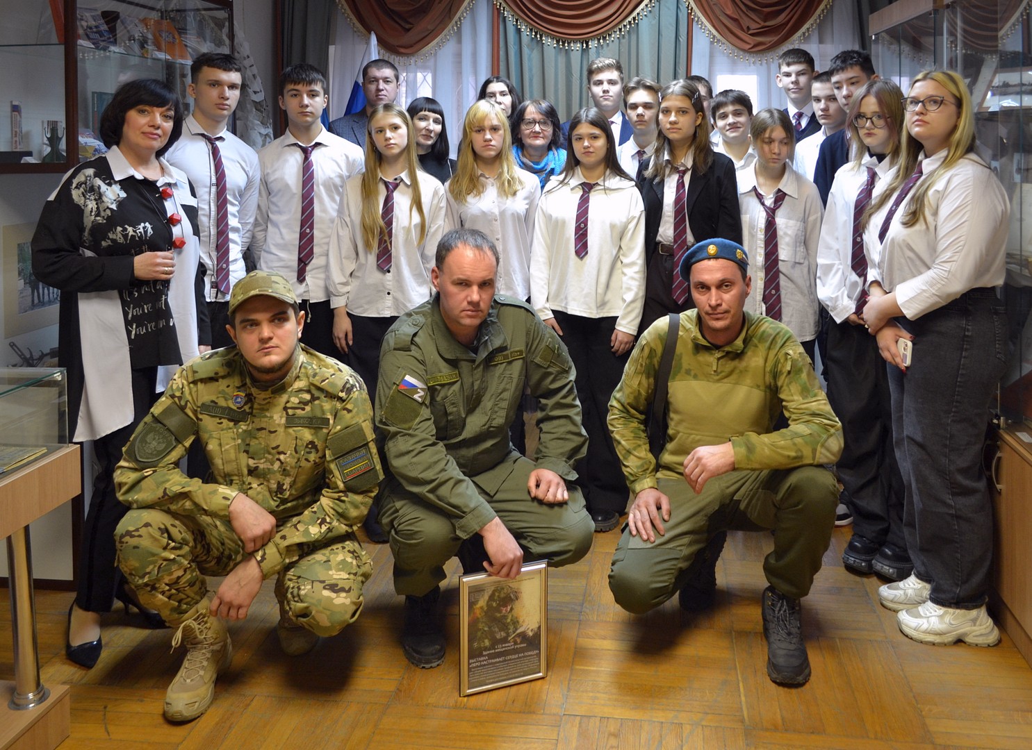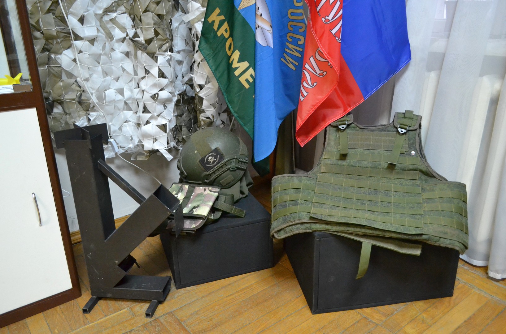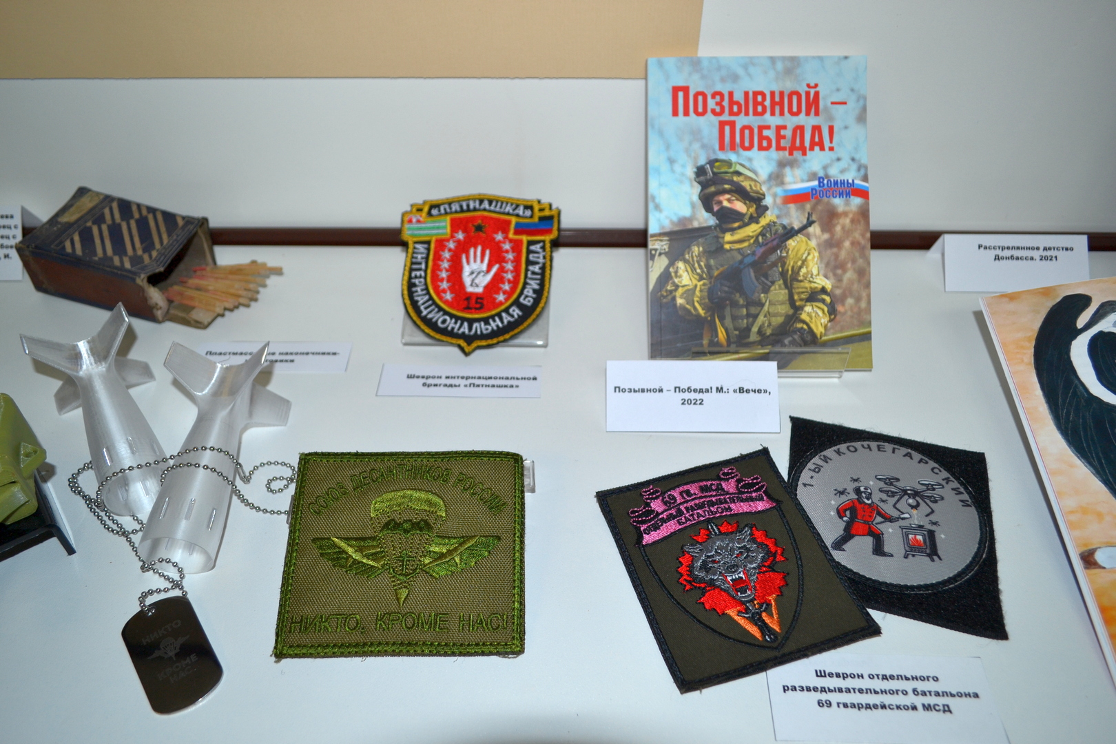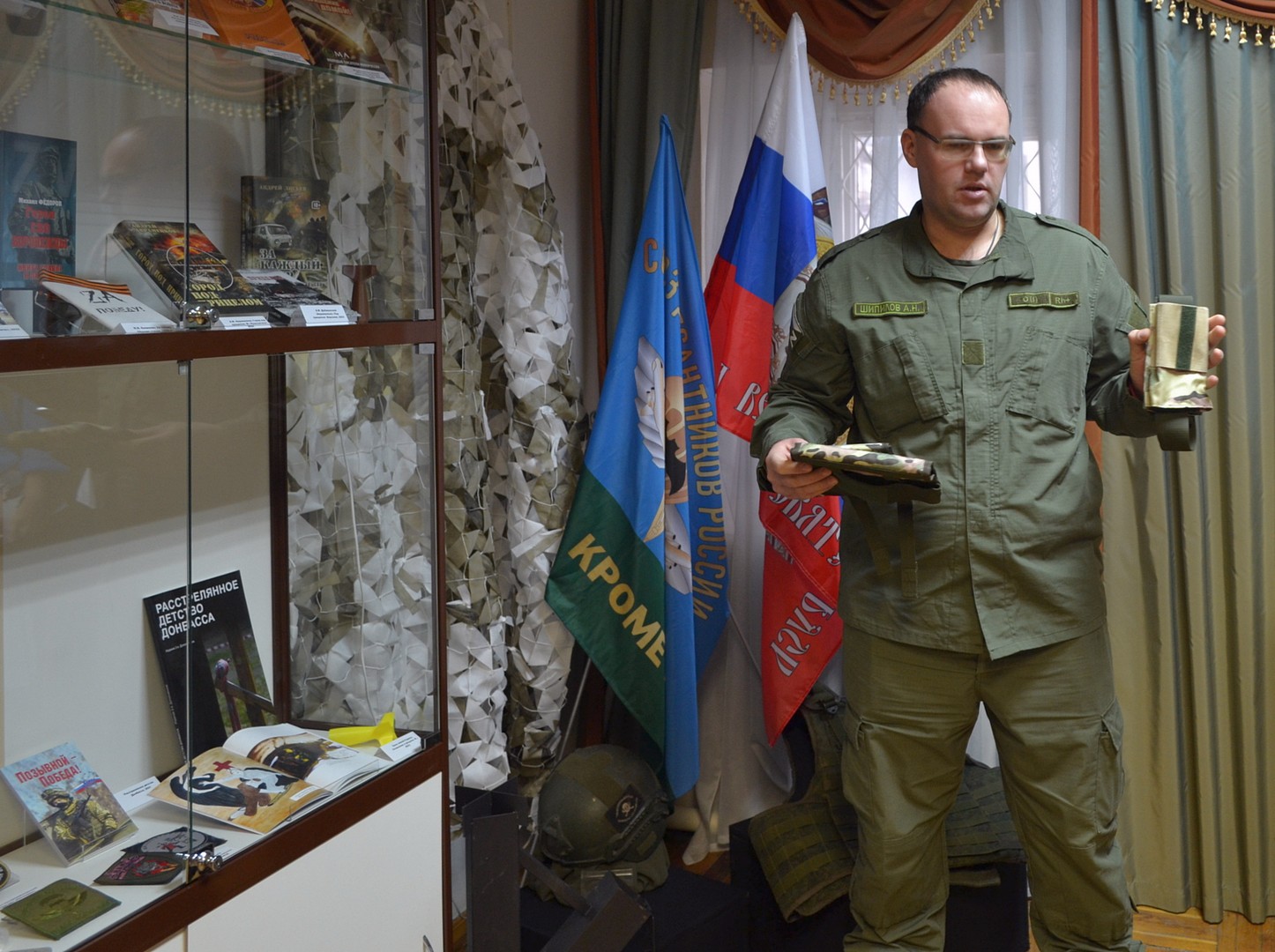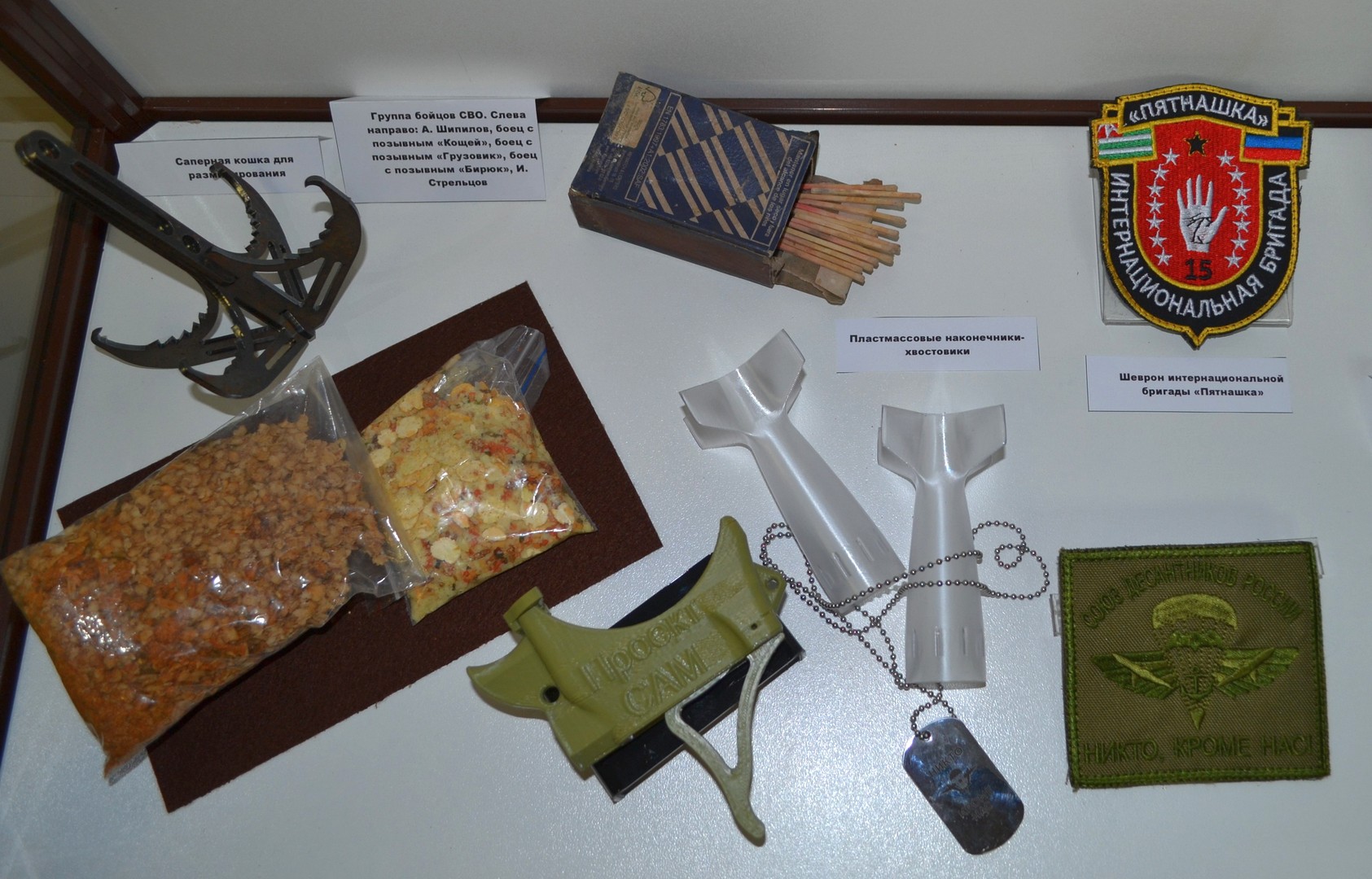 Пространство выставки наполнено трофеями из зоны проведения СВО – их в фонд музея передали представители Воронежской региональной общественной организации по объединению и содействию ветеранов десантных войск «Союз десантников». Руководитель организации Андрей Шипилов рассказал о предназначении каждого предмета, а также обозначил основные направления волонтерской деятельности, связанные с оказанием помощи солдатам СВО. Специально для школьников несколько бойцов русской разведки записали ободряющие обращения. Именно от тех, кто сейчас на передовой, особенно важно было услышать слова, внушающие уверенность в Победе.