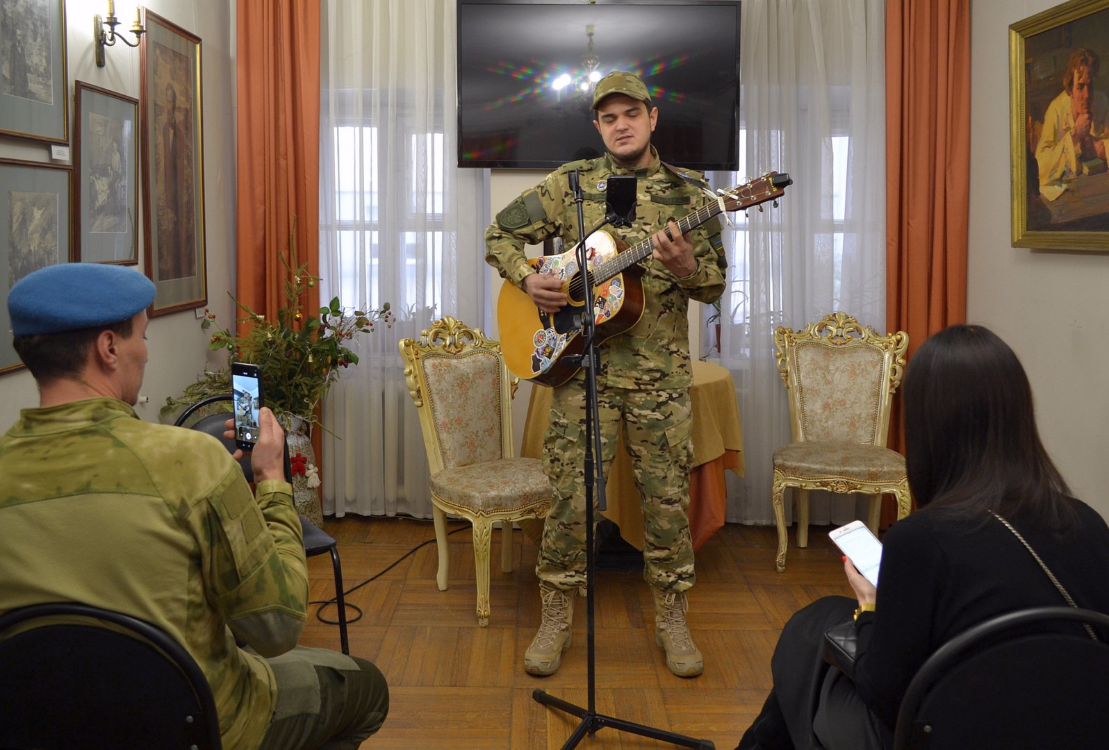 Музыкант Константин Зыков, представитель Воронежской региональной общественной организации по объединению и содействию ветеранов десантных войск «Союз десантников» под аккомпанемент гитары исполнил воодушевляющие песни, связанные с выполнением военного долга.