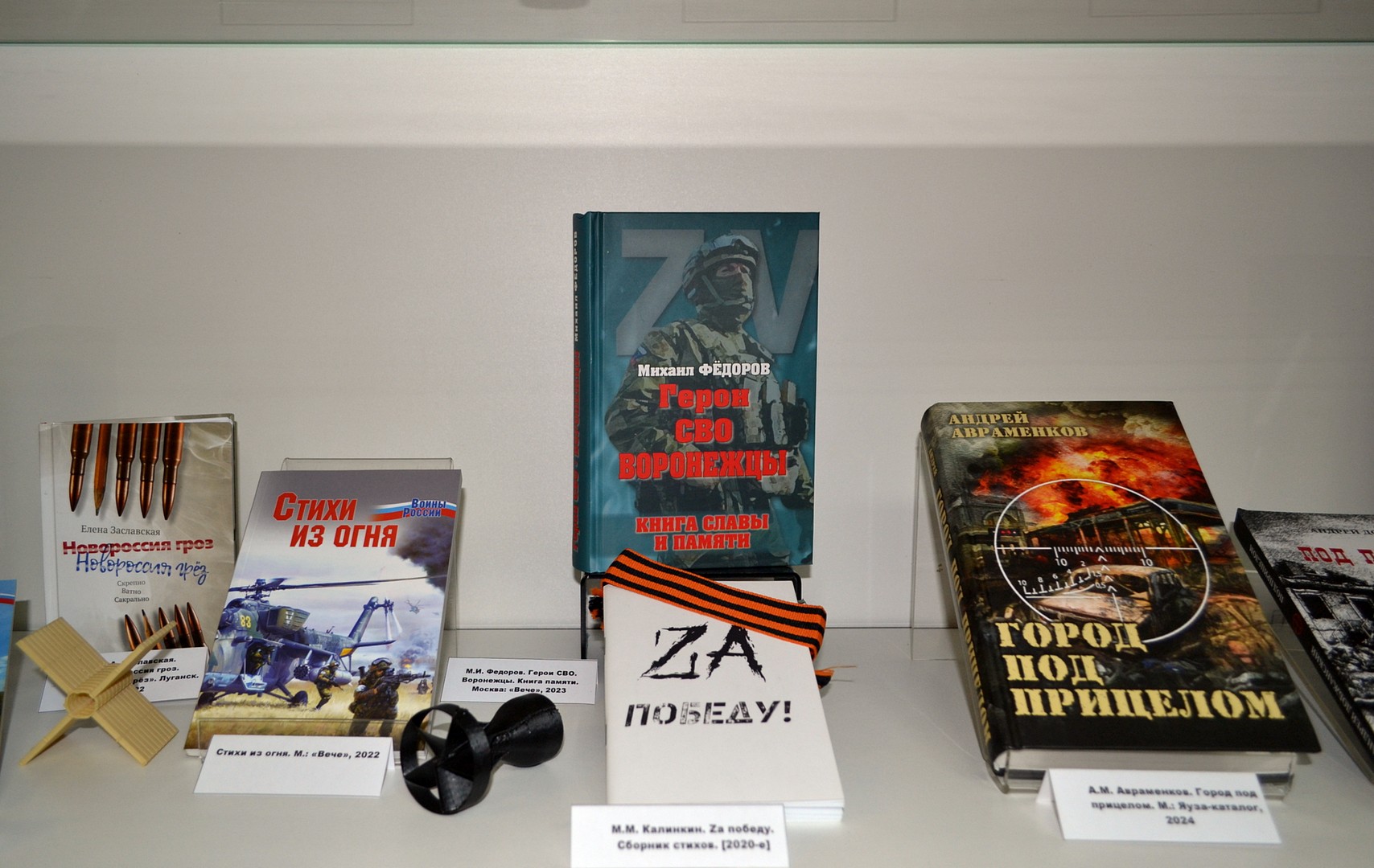 Первыми зрителями выставки стали старшеклассники из школы №71, воронежские литераторы и историки. Презентационную экскурсию провела старший научный сотрудник ЛитМузея им. И.С. Никитина Жанна Леденева. Она рассказала об изданиях, посвященных сегодняшним героям Отечества, поэтических сборниках о войне, авторами которых являются бойцы, вставшие на защиту России. Особый интерес представляют книги А. Добжанского (Авраменкова) «Русская весна в Луганске. Как начиналась война», М. Федорова «Герои СВО. Воронежцы», «Под прицелом», М. Некрасовского «Кровавая пыль. Летопись войны», сборник стихов М. Калинкина «ZA ПОБЕДУ!» и другие издания.