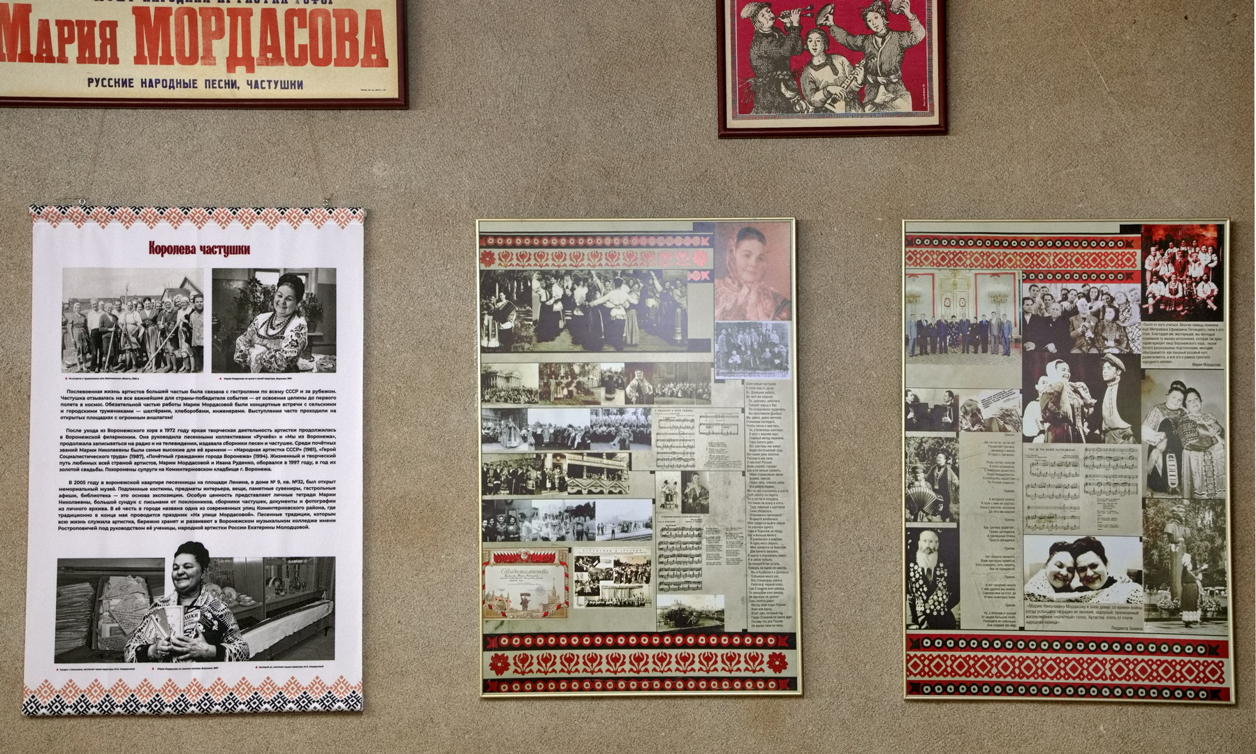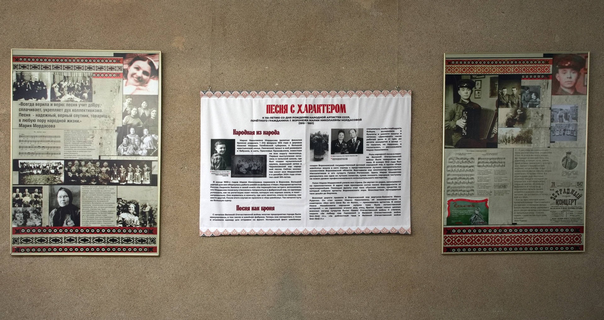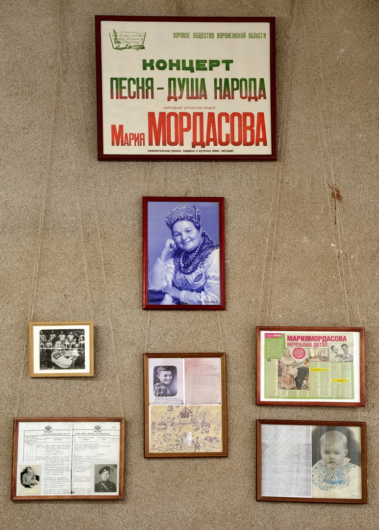 Выставка приурочена к 110-летию со дня рождения народной артистки СССР, почётного гражданина Воронежа Марии Николаевны Мордасовой (1915 – 1997) и знакомит с жизнью и творчеством знаменитой артистки. С первого до последнего дня её судьбу определяла любовь к русской народной песне и частушке.