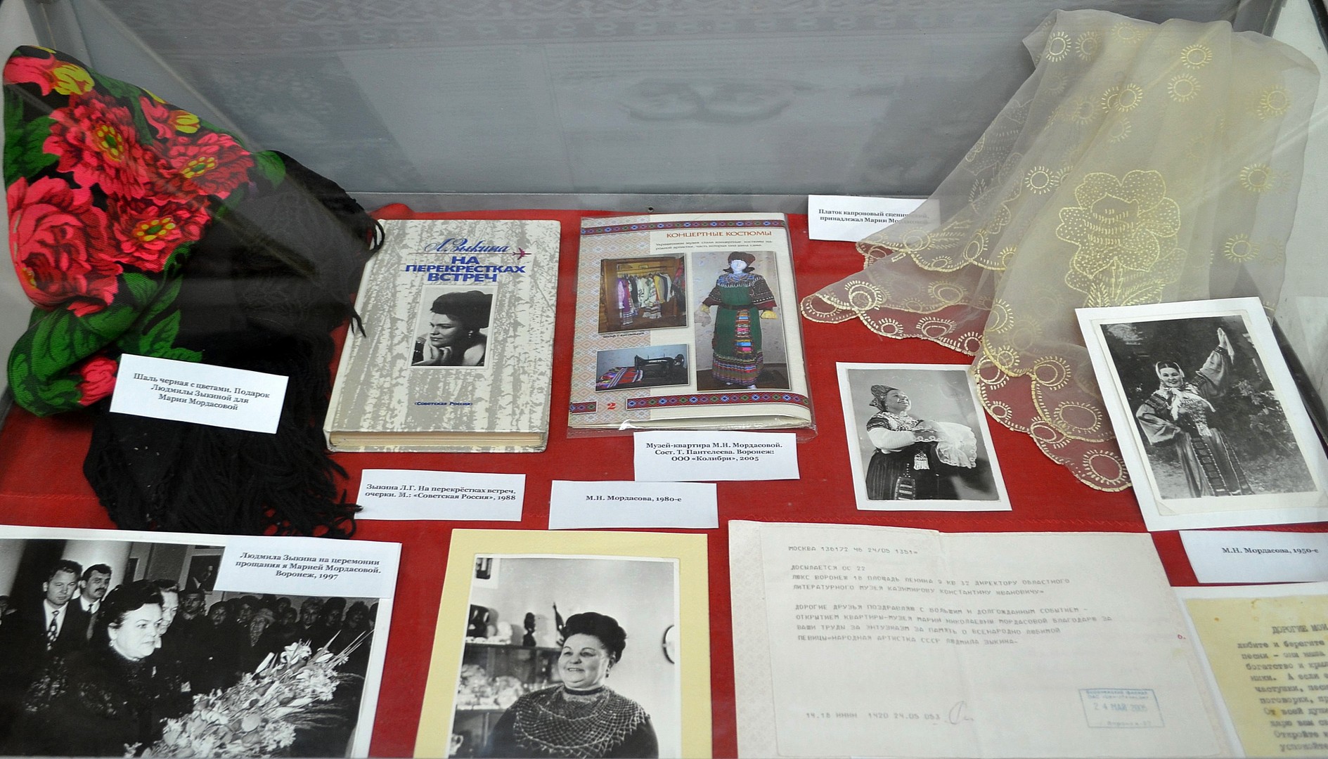 Первый раздел выставки посвящен ранним годам жизни Марии Мордасовой, а также Митрофану Пятницкому и Петру Пономареву, внесшим большой вклад в развитие сценической культуры. Как Митрофан Пятницкий считается родоначальником народного хорового искусства, так и Мария Мордасова является певицей, ставшей первой исполнительницей частушек на профессиональной сцене. Здесь же экспонируются знак «Почетный гражданин города Воронежа», принадлежавший артистке, ее ранние фотографии, тематические книжные издания. Следующий раздел представлен подарками, в том числе книгой «Народные песни Ивановской области» от ивановских ткачих с автографом, вышитым гладью портрет певицы, переданный в дар Музею-квартире М.Н. Мордасовой к 100-летию артистки в 2015 году коллегой Мордасовой по Воронежскому хору Евгенией Черепановой. Работа над портретом заняла четыре года. Наиболее интересными экспонатами этой части выставки являются шаль, подаренная Людмилой Зыкиной, телеграмма, которую Людмила Георгиевна прислала к открытию Музея-квартиры М.Н. Мордасовой в 2005 году и её книга «На перекрестках встреч», куда при переиздании в 1988 году добавлена глава о Мордасовой. Экспозицию завершает тема концертных платочков. Зыкина рассказывала, что училась «играть» платком на сцене у Марии Николаевны.