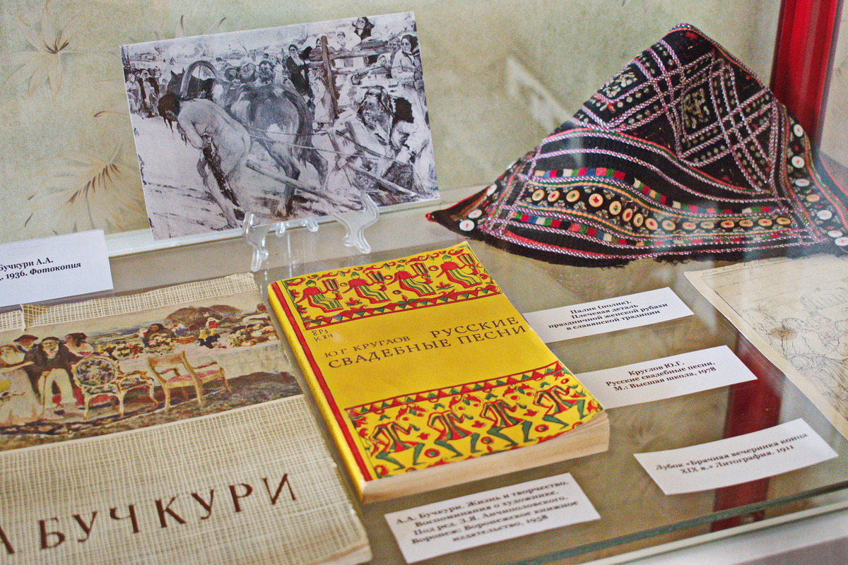 В музее-квартире М.Н. Мордасовой открылась выставка «Свадебный обряд в русской культуре XIX в.». Выставка знакомит с русской брачной традицией и ее отражением в литературе, искусстве и показывает отличия в укладе жизни разных сословий. Первый раздел выставки посвящен традиционной крестьянской свадьбе. Праздничный народный костюм представлен кичкой — старинным женским головным убором Нижнедевицкого района Воронежской области, принадлежавшей Марии Мордасовой, и традиционной женской рубахой воронежско-белгородского пограничья с черноузорной вышивкой. Дополняют раздел предметы крестьянского быта и книжные издания о свадебном фольклоре. Редкие фотографии Тамбовской губернии начала XX века иллюстрируют разделение мужских и женских ролей в деревенском быту, а фоторепродукция картины воронежского художника А. Бучкури «Вывод» показывает наказание женщины, уличенной в измене мужу. Второй раздел выставки как бы воссоздает образ посословного уклада жизни России XIX века, а также показывает развития литературно — художественной мысли от романтических представлений о гармонии в любви до идей о свободных отношениях и равноправии полов. Элементы свадебного обряда того времени изображены на фотографиях и репродукциях картин В. Пукирева, Ф. Журавлева, Н. Неврева, а также на иллюстрациях к классическим литературным произведениям. Среди экспонатов выставки редкие издания А. Коцебу, Н. Карамзина, А. Пушкина. Выставка также знакомит с любовными историями Василия Жуковского и Алексея Кольцова, Александра Эртеля и Ивана Бунина. На открытии со вступительным словом выступила младший научный сотрудник Музея имени И.С. Никитина Екатерина Агеева. После рассказа об особенностях института брака в XIX веке прошла презентационная экскурсия по выставке. Вернисаж завершился обсуждением свадебных традиций регионов России и СНГ и показом документального фильма «Русская свадьба», снятого в селе Россошки Воронежской области. Выставка будет работать в Музее-квартире М.Н. Мордасовой по 21 ноября 2020 г. Цена билета: 70 — 330 руб.