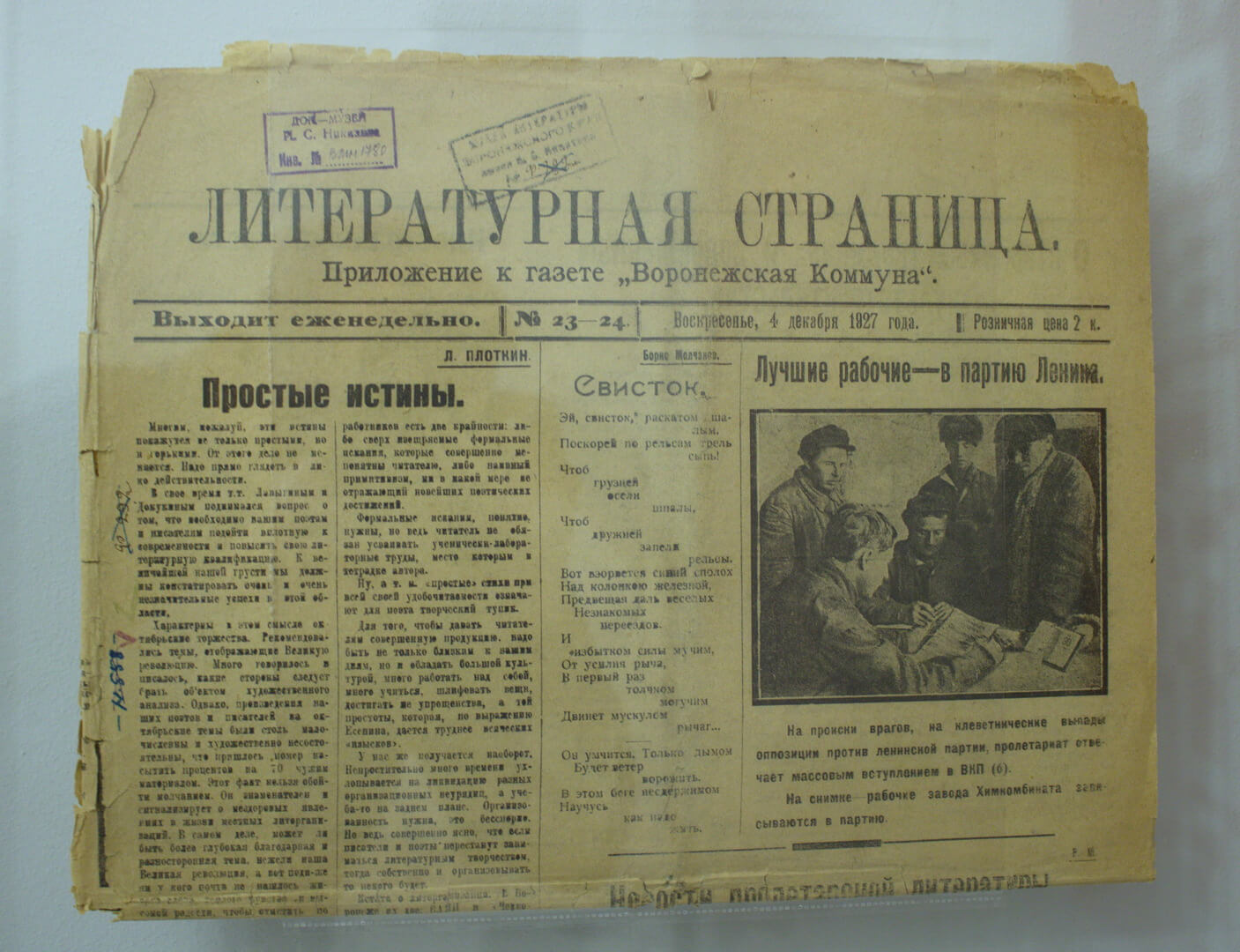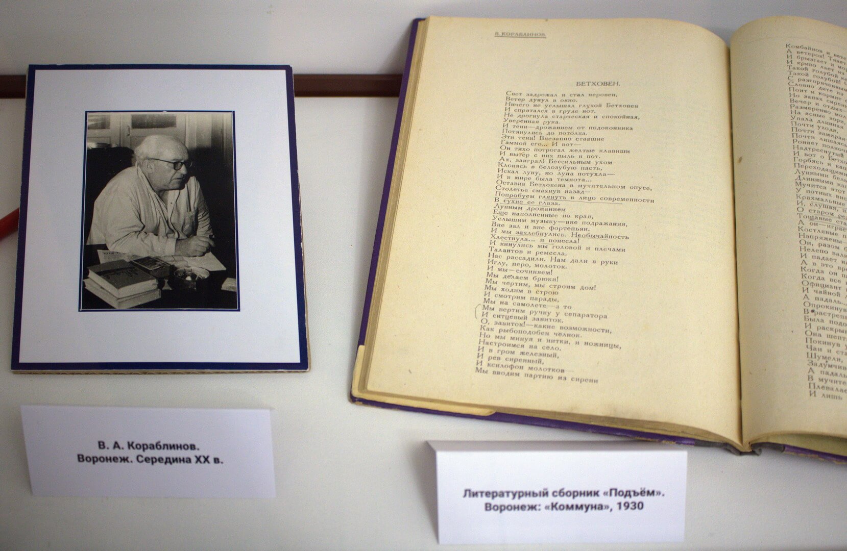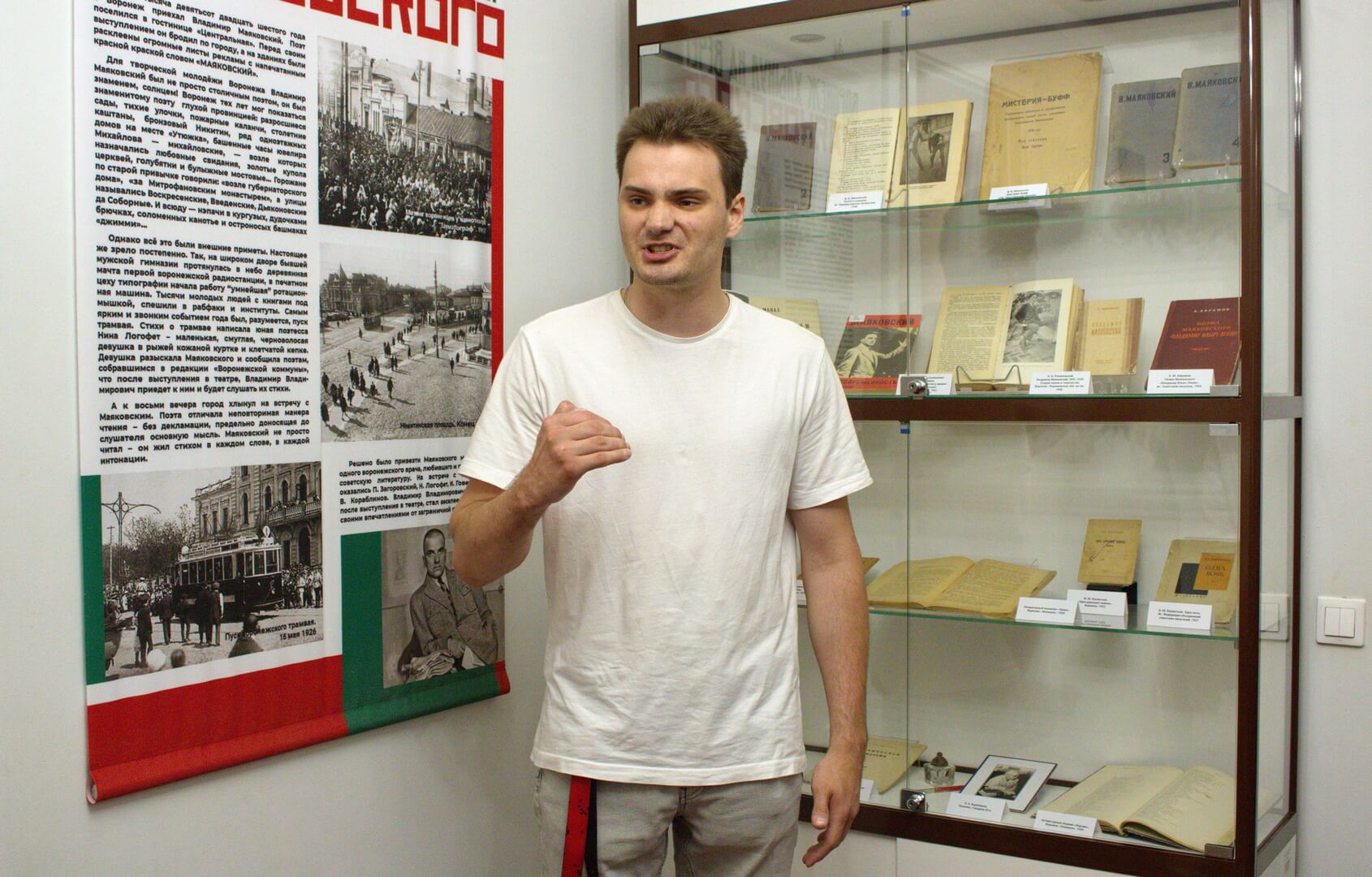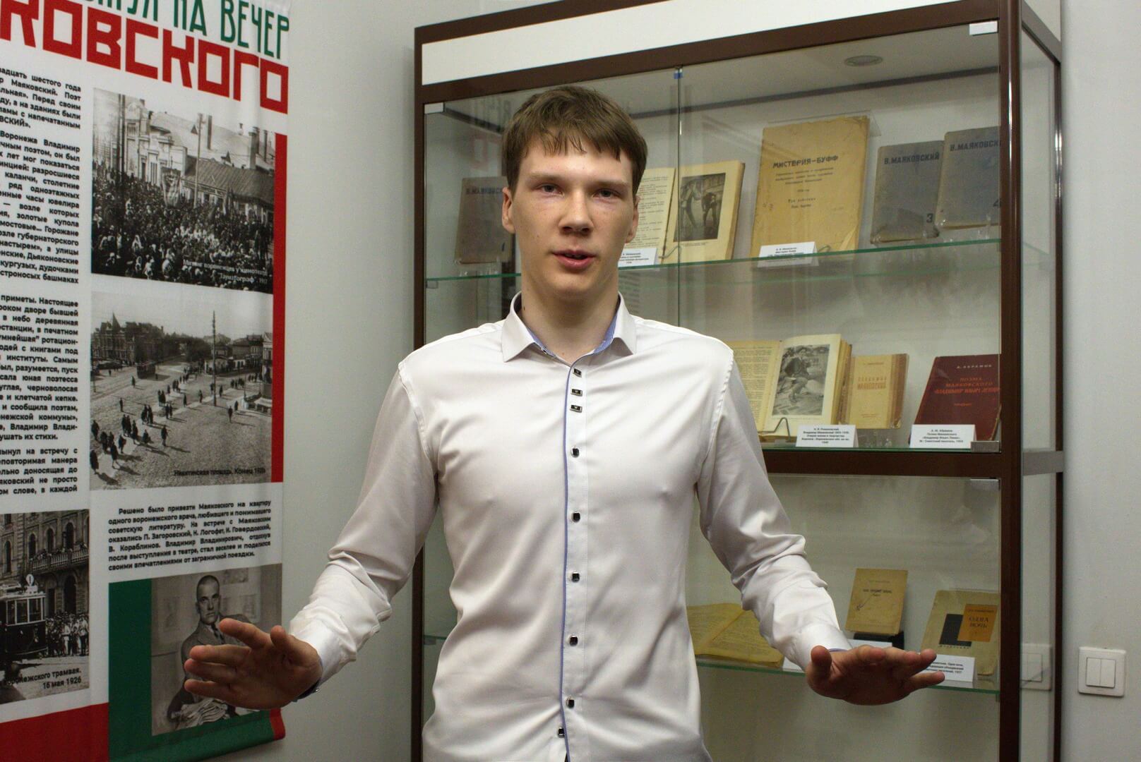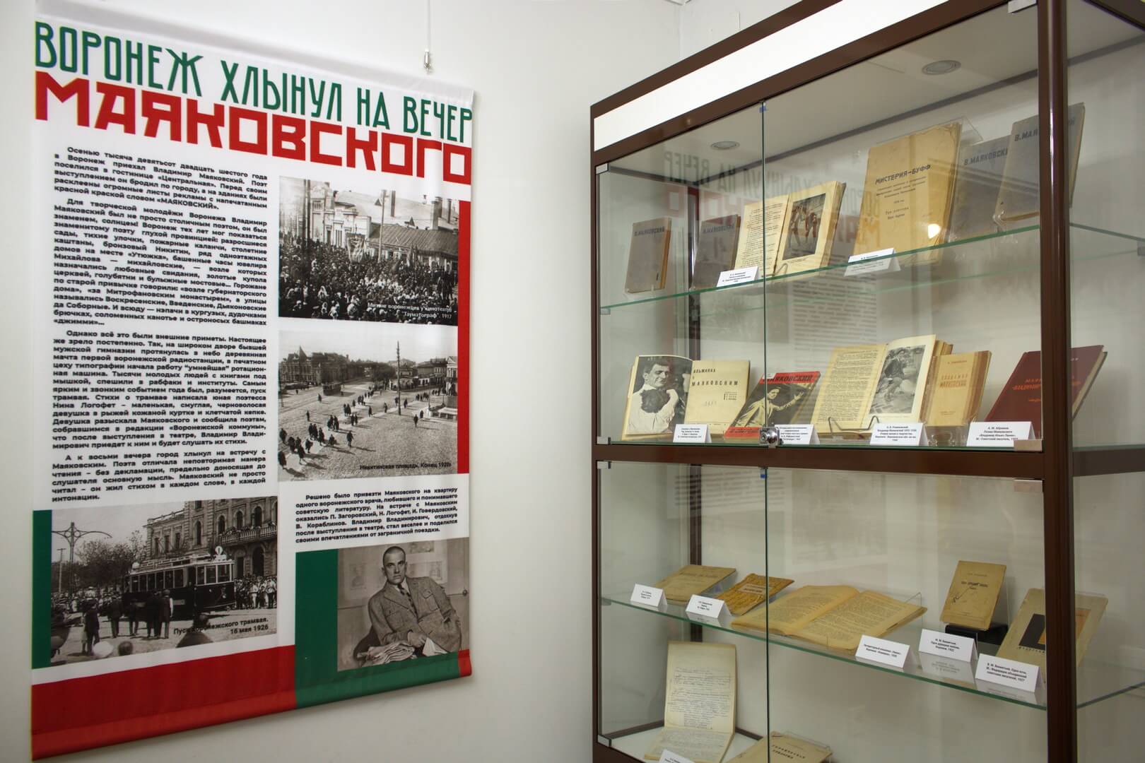 18 мая в Доме-музее И. С. Никитина состоялось открытие выставки «Весь город хлынул на вечер Маяковского». В самом начале прозвучали грамзаписи с голосом самого Владимира Маяковского, а также стихотворение «Лиличка! Вместо письма» в исполнении актера Олега Басилашвили. Старший научный сотрудник музея Олег Фенчук представил выставку и рассказал о Воронеже начала XX, культурной жизни города, о том, что привело пролетарского поэта в город. Речь шла о революционном творчестве Маяковского, о заграничном турне поэта по США и Мексике, путешествии по Европейским странам. В Воронеже Владимир Владимирович выступил с программой «Мое открытие Америки». Знаменитый столичный литератор увез в Москву стихотворения молодых воронежских поэтов Нины Логофет и Владимира Кораблинова, с целью их публикации. Стихи увидели свет в журнале «Новый ЛЕФ», редактируемом Маяковским. Отдельная часть экспозиции посвящена В.А. Кораблинову, оставившего воронежцам самые интересные воспоминания о вечере Маяковского. Среди экспонатов: фотографии мест, где бывал Маяковский в Воронеже и молодых воронежских поэтов и писателей, плакаты «Окна РОСТА», собрания сочинений Маяковского, книги Владимира Кораблинова, воспоминания о Маяковском воронежских писателей. Олег Фенчук привел факты жизни В. Маяковского, прочитал строки его стихотворений. Под занавес мероприятия выступили выпускники театрального отделения Детской школы искусств № 1 (класс Надежды Павловны Красиковой). Иван Фурсов и Дмитрий Пилипенко прочитали стихотворения «Подлиза» и «Сергею Есенину». Выставка продолжит свою работу до 27 августа.