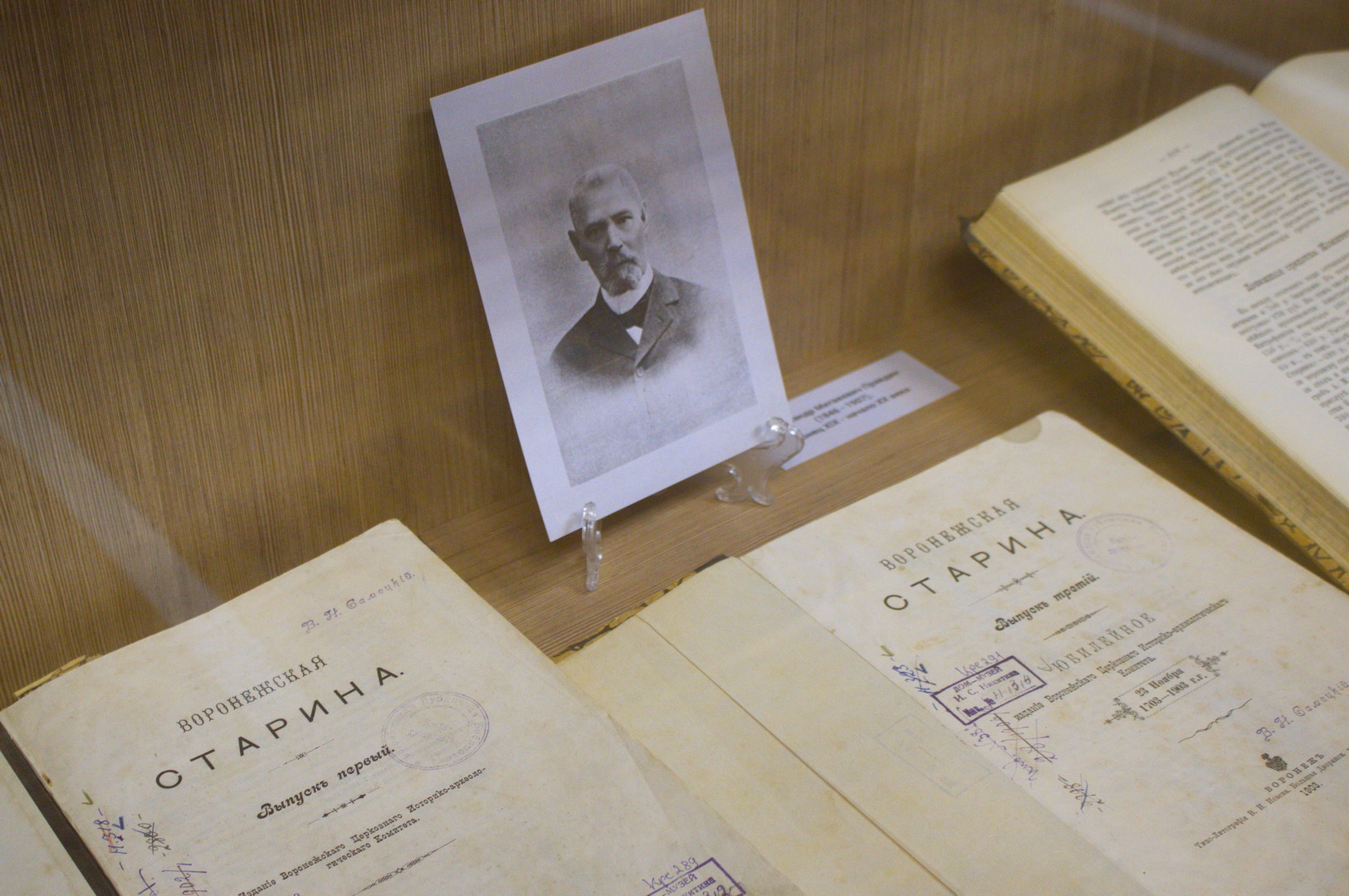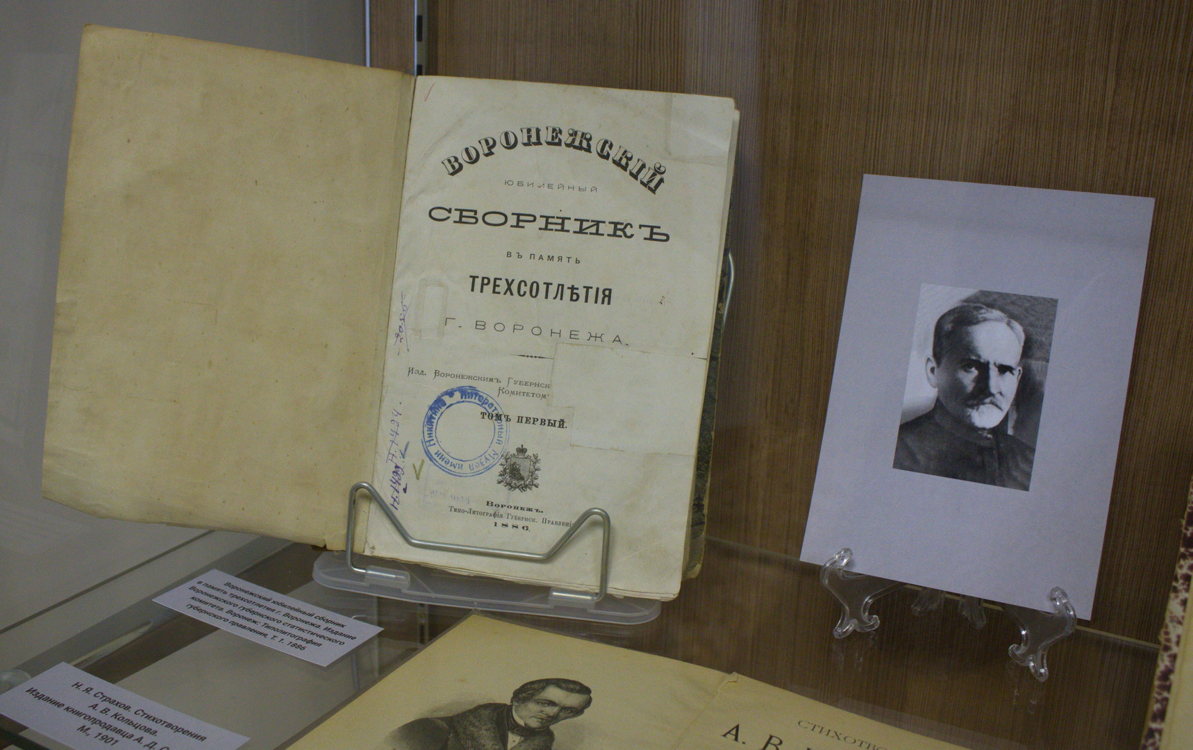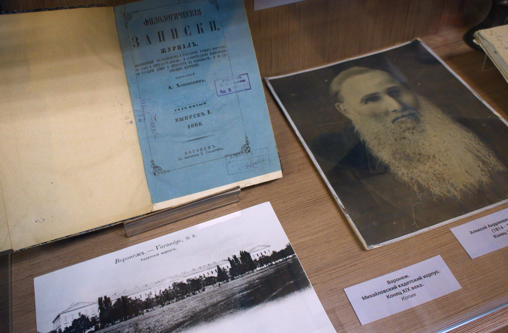 Выставку продолжает альманах «Воронежская беседа на 1861 год» В нем опубликованы литературно-критические и историко-этнографические статьи. Беллетристика представлена произведениями воронежских поэтов А. В. Кольцова и И.С. Никитина и повестью А. С. Суворина. Большое место в сборнике отведено пословицам из собрания Кольцова, обрядовому фольклору. В альманах помещены также статистические материалы по истории заселения губернии, архивные материалы Воронежского губернского правления. Завершает экспозицию гимназические малотиражные издания: «Журнал учащихся»(1909) и «Порыв»(1911) 1-й Воронежской мужской гимназии, журнал Мариинской женской гимназии «Объединение». Кроме этого на выставке экспонируются и другие книги тех лет, фотографии и документы из фондов литературного музея. Открытие выставки началось рассказом завотделом Музея имени И.С. Никитина Ольги Уразовой об уникальности выставленных, газет, журналов, документов и фотографий. Затем старший научный сотрудник музея Жанна Леденева провела экскурсию по выставке, делая акцент на актуальности экспозиции. Продолжил вернисаж обстоятельный рассказ учредителя фонда А.А. Хованского Андрея Лазарева о рождении филологии как науки в России и значении трудов А.А. Хованского.