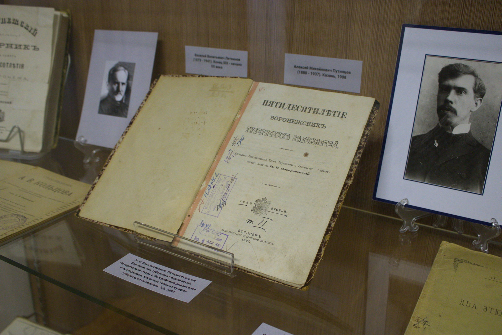 В историко-статистическом разделе выставки представлен ежегодник «Памятная книжка Воронежской губернии». Это научно-справочное издание Воронежского губернского статистического комитета является ценным источником для изучения истории, географии, экономики Воронежской губернии. Всего было выпущено33 тома. На выставке представлены «Памятные книжки» за 1899 и 1908 годы. Особый интерес представляет экземпляр с автографом краеведа В. В. Литвинова, автора многочисленных публикаций ежегодника. В разделе религиозной журналистики важное место занимают «Воронежские Епархиальные ведомости» № 8 за 1911год. В издании опубликованы указы Синода, материалы о приходах, биографические очерки иерархов, жизнь воронежского духовенства. Здесь же двумя выпусками (за 1903 и 1909 года) представлен ежегодный журнал «Воронежская старина» Воронежского Церковного Историко-Археологического Комитета. Всего было подготовлено 14 томов ежегодника. Экспозиция также знакомит с научно-педагогическим журналом «Филологические записки» (выпуски I-V за 1866 год), издателем и редактором которого долгое время был учитель Михайловского кадетского корпуса Алексей Андреевич Хованский. В нем печатались статьи отечественных и зарубежных авторов. 'Филологические записки' были популярны и востребованы. Журнал расходился по подписке, в том числе и в зарубежные университеты. Здесь же представлена рукопись А.А. Хованского «Мой биографический журнал» (1847).