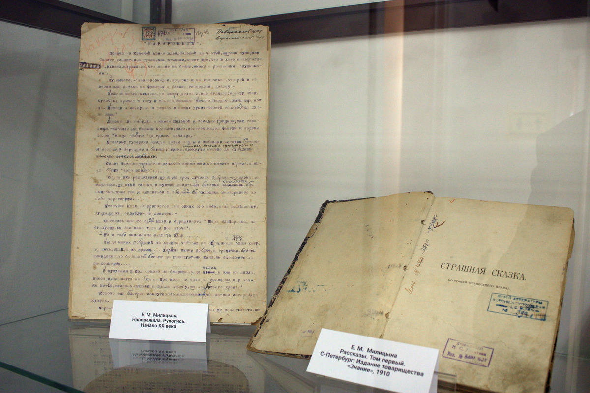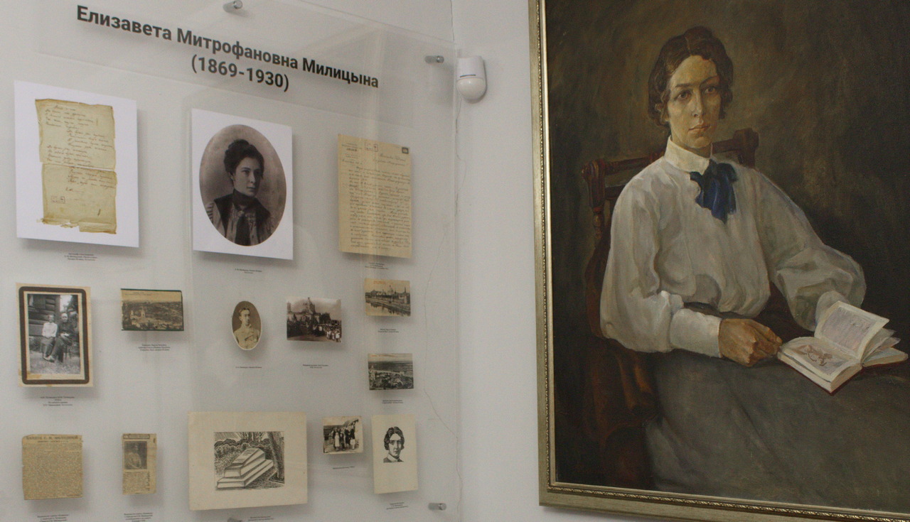 Третий раздел выставки знакомит с писательницей Елизаветой Митрофановной Милицыной. Будучи не только прозаиком, но и еще журналистом Милицына вместе со своим мужем совершила ряд этнографических путешествий по селам и деревням России и в дальнейшем опубликовала свои заметки о быте крестьян в таких рассказах как: «Утрата», «Наворожила», «Деревенские картинки», «На Голубинке» и др. В 1929 г. Милицына, отправляется в командировку от Воронежского областного краеведческого музея на северо-востоке области с целью изучения крестьянского быта. В ходе поездки было обследовано более 10 населённых пунктов Воронежского и Нижнедевицкого уездов (Устье, Гремячье, Костёнки, Рудкино, Борщёво, Оськино, Яблочное, Кочетовка, Семидесятное, Истобное, Краснолипье). По материалам поездки она написала очерк «По селам ЦЧО с котомкой». Впервые очерк был опубликован в журнале «Подъём» лишь в 2001 г. (публикация сотрудников Воронежского областного литературного музея).