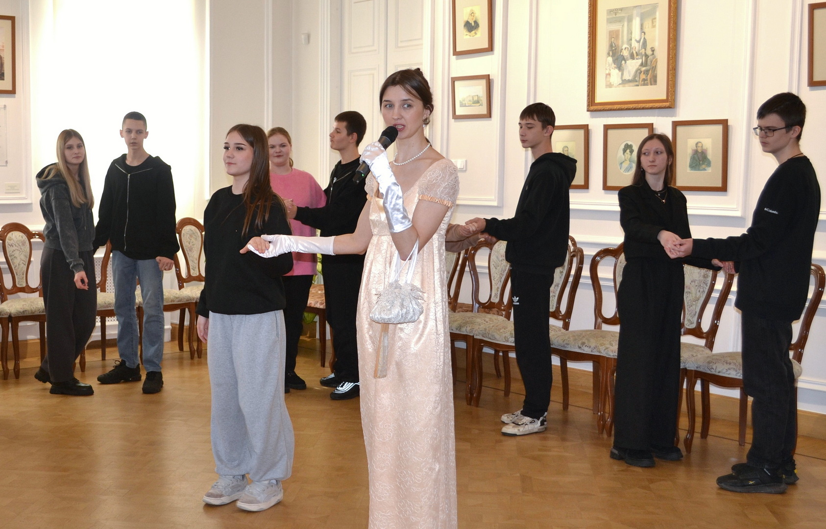 Завершился вернисаж в каминном зале: для гостей было сыграно несколько вальсов, написанных современниками Грибоедова. А финальным подарком для присутствующих стал мастер-класс по историческим танцам, который провели мастера танцевальной студии «Каменный мост». Они рассказали о том, что танцевали на балах в XIX веке, и все посетители почувствовали себя приглашенными на бальное торжество.